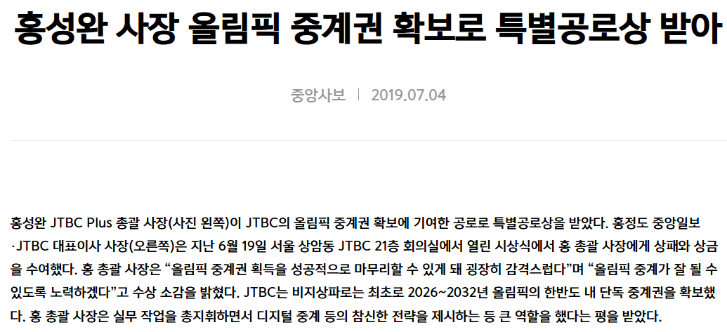 언론계 한편에서는 홍성완 대표이사를 2선인 고문으로 한 인사가 SBS를 비롯한 지상파 3사에게 중계권 재협상을 위한 포석이 아니겠느냐는 이야기가 돌았다. 하지만, 결국 JTBC는 지상파 3사 중 어디와도 협상에 이르지 못하고, 2026년 동계올림픽 단독중계를 선언하게 되었다.