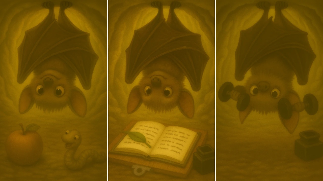 코로나 때문에 막연하게 밉게만 느껴지던 박쥐인데, 이번에는 친근하고 귀엽게 거꾸로 매달려서 공부도 하고 운동도 하는 박쥐의 모습을 AI로 그려보았다 :)