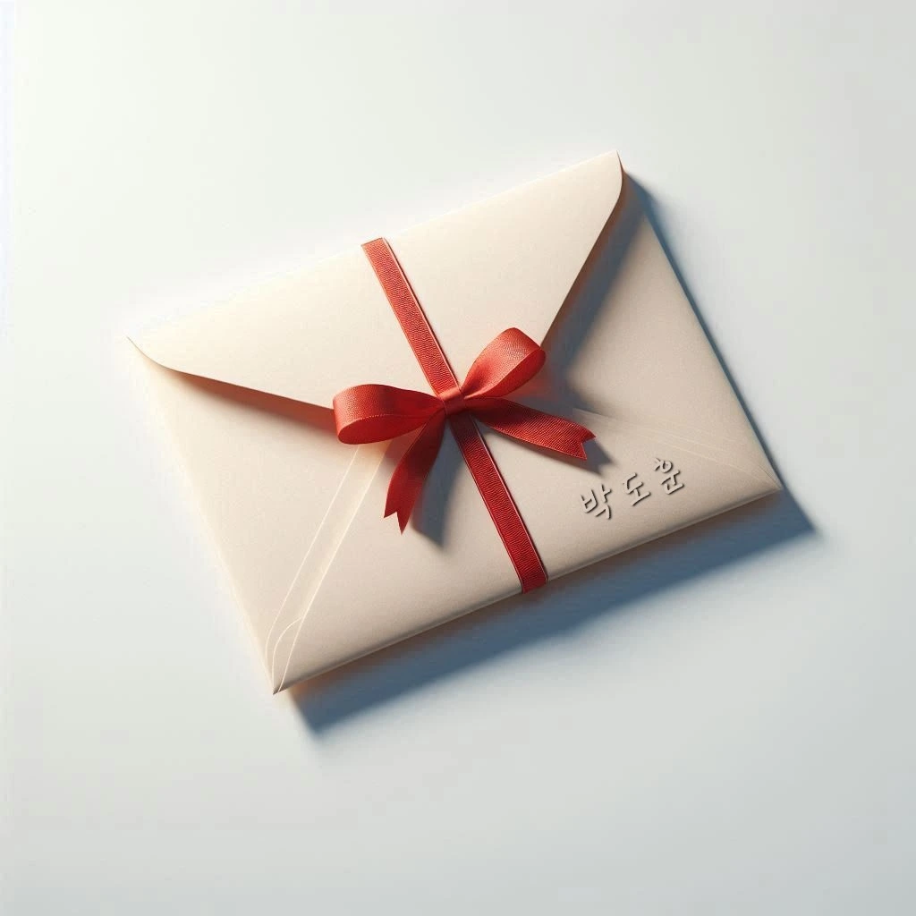 그녀가 빨간 리본 봉투를 건네며 말했다.