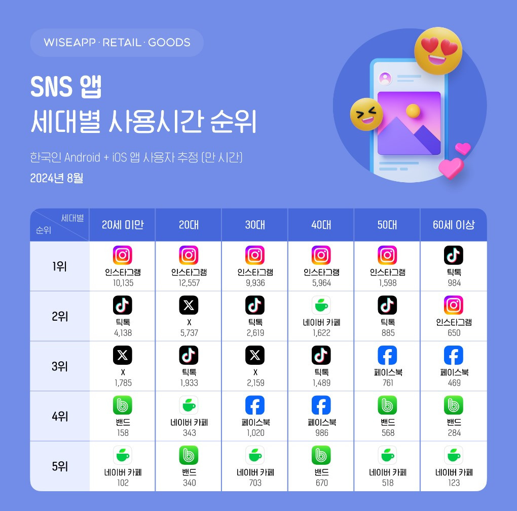 모바일 앱 사용자 데이터 분석기관 와이즈앱의 최신 발표 자료에 따르면 현재 대한민국 인스타그램 유저 수는 약 2,500만 명으로 압도적인 1위를 자랑한다. 세대별 SNS 사용시간 순위에서도 60대에서 2위를 차지한 것을 제외하면 전 연령대에서 인스타그램이 1위로, 사용시간 또한 월등하게 긴 것으로 나타났다. 여성 소비자들이 쇼핑을 즐기는 공간 특성과 더불어 높은 구매력을 가진 2050 타겟들이 대거 포진해 있는 곳, 인스타그램 커머스가 잘 될 수밖에 없는 이유다.
