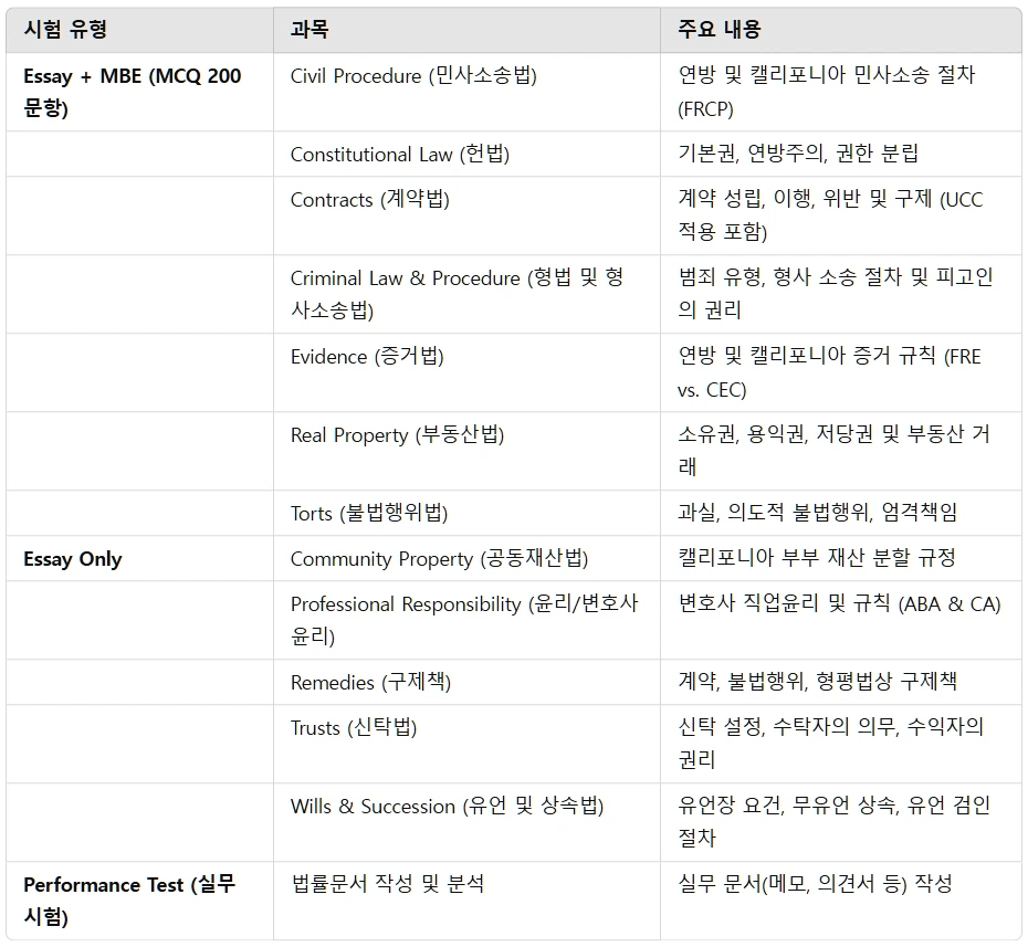 캘리포니아 Bar 시험 과목은 다음과 같다.