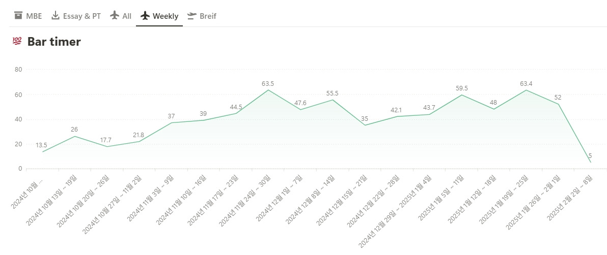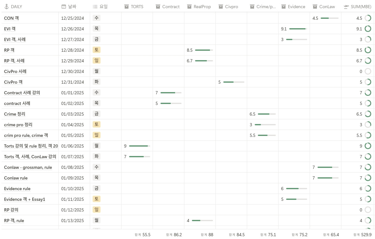 공부시간 역시 Notion을 활용하여 날짜별로 어떤 과목을 얼만큼 공부했는지, 합계 공부시간이 얼마나 나왔는지 한 눈에 볼 수 있도록 기록했다. 아래 표는 2025년 1월 말까지 기록한 MBE 7과목 공부시간 중 일부인데, 일별 공부 과목과 공부 시간, 총 합계 시간도 알 수 있다. Bar 시험의 경우 12과목 + PT시험까지 준비해야 할 과목이 정신없이 돌아가므로 과목별로 하루이틀씩만 공부해도 최소 3주 이상이 지나가고, 처음에 본 과목은 기억에 이미 없다. 그래서 얼마나 내 머릿속에서 기억이 날아가고 있는지 체크하기 위해서도 Notion의 표를 활용했다.