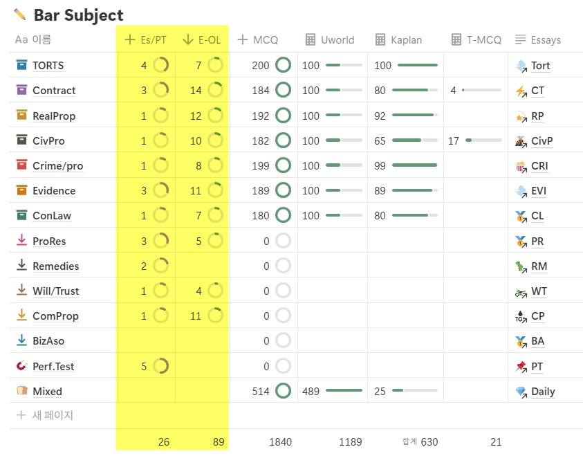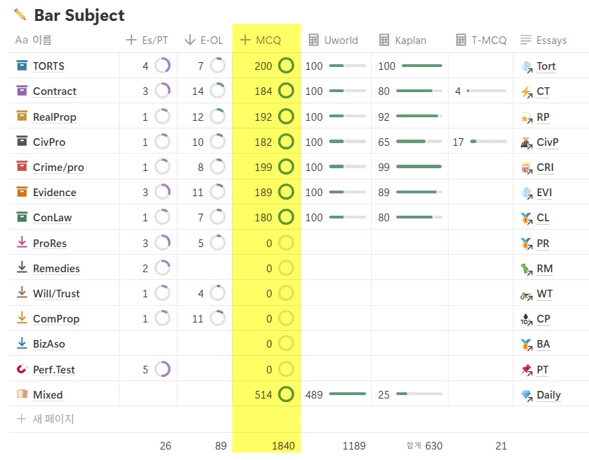 MBE는 Kaplan 100문제씩, Uworld 100문제씩까지는 과목별로 회독과 함께 풀었다. 그 다음부터는 Mixed set로 시작해서 처음에는 17문제, 그 다음에는 34문제, 그 다음은 50문제씩 분량을 늘려 가면서 Mixed set를 제한된 시간 내에 해결하는 감을 잡아 나갔다. MBE 문제는 문제를 쭉쭉 풀고 채점한다고 해서 실력이 향상되지 않는다. 문제를 맞든 틀리든 문제에서 묻는 rule을 정확히 리뷰하고 어떻게든 기억해야 한다 (내 경우는 한 권의 교재에 단권화하고 시험 직전에 빠르게 훑는 방식으로 기억했다). 처음에는 과목별로 문제를 풀었고 1문제를 풀고 리뷰하는 데에 평균 10분, 17문제는 3시간이 걸렸다. 과목별로 200문제를 풀고 리뷰 및 관련 rule을 단권화하고 나니까 1월 말이 되었고, Mixed로 풀면서부터 1문제를 풀고 리뷰하는 데에 평균 5분 정도로 단축되어 더 많은 문제를 풀어나갈 수 있었다. 그래서 결과적으로는 MCQ 1840문제를 풀었다 (아래 표는 Notion의 database이다). 다시 한번 강조하지만 Kaplan은 추천하지 않고, Adaptiva 또는 Uworld를 골라잡고 일단 그것부터 해결하기를 바란다.