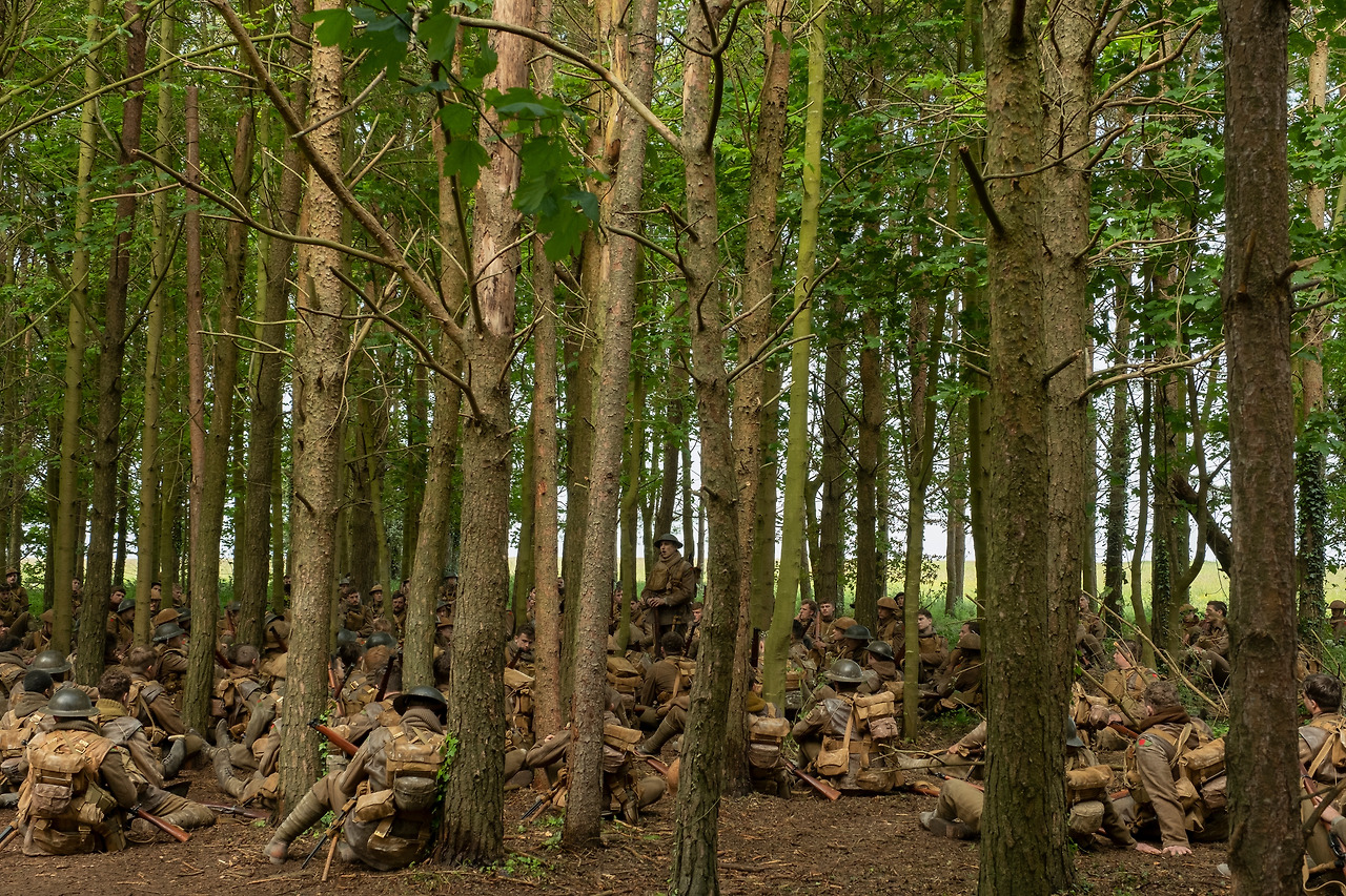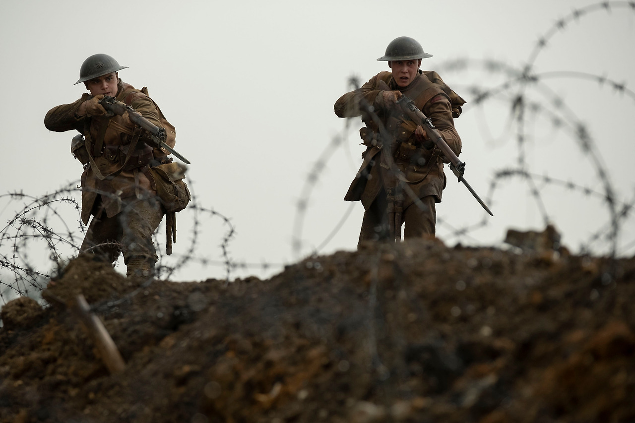 1917년 4월 6일, 제1차 세계대전이 한창인 프랑스 전선에서 독일군과 대치 중인 영국군에 소속된 블레이크(딘-찰스 채프먼)와 스코필드(조지 맥케이)는 조용한 들판 주변에 널브러져 잠을 자고 있다. 그런데 누군가 다가와 블레이크를 발로 툭 차서 잠을 깨우더니 동료 한 사람과 함께 사령관을 찾아가라는 지시사항을 전한다. 몸을 일으킨 블레이크는 나무에 기대어 자고 있던 스코필드에게 손을 내밀고, 두 사람이 함께 몸을 일으키자 그들을 비추던 카메라 역시 고개를 들고 움직이기 시작한다. 객석을 향해 나아가듯 후진하는 카메라를 따라 전진하는 두 군인 옆으로 티타임을 기다리며 바닥에 편히 앉아 도란도란 대화를 나누는 군인들의 모습이 눈에 들어온다. 예비군 훈련장만큼이나 느슨하고 무료해 보이는 풍경을 뒤로 밀어내며 전진하는 두 사람을 비추던 카메라가 비좁은 참호 속으로 미끄러지듯 들어서자 스크린으로 점차 전쟁의 기운이 스며들기 시작한다.