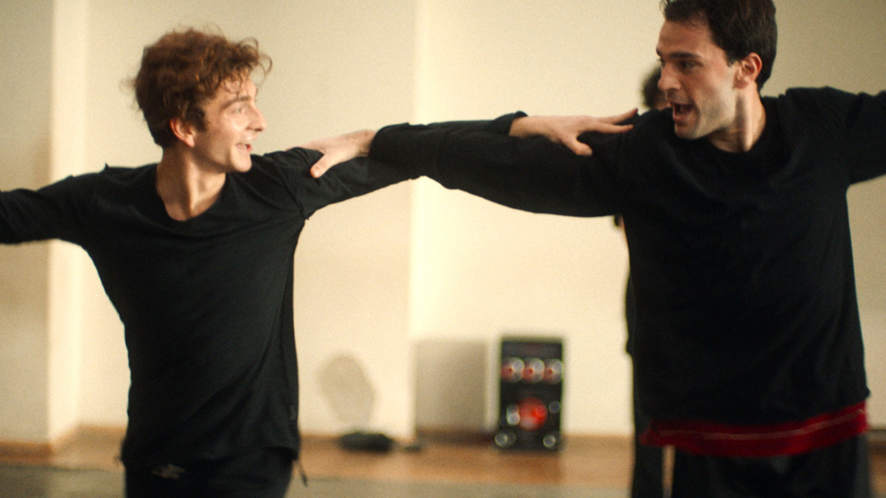 <그리고 우린 춤을 추었다>는 어떤 현실의 벽과 부딪히며 시작하는 영화다. 조지아 국립무용단에서 소속된 메라비(레반 겔바키아니)는 무용단을 이끄는 단장으로부터 매번 남성적인 힘이 부족하다는 지적을 받는다. 메라비와 한쌍을 이룬 마리(아나 자바히슈빌리) 역시 정숙하지 못하다는 지적을 받는다. 젊은 무용가들은 이런 지적에 웃음을 터트리지만 단장은 보수적인 남성성과 여성성이 춤의 전통성임을 고압적으로 주장하며 윽박을 지를뿐이다. 그런 가운데 갑자기 무용단에 합류하게 된 이라클리(바치 발리시빌리)는 귀걸이를 했다는 이유로 처음 만난 단장에게 호통부터 듣지만 곧 실력을 인정받고 메라비의 자리를 꿰차게 되고, 메라비는 이라클리를 의식하기 시작한다.