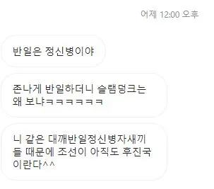 일단 연진이가 보낸 DM은 자기 수준에 어울리는 의식의 흐름에 따라 작성된 것으로 보이는데 ‘반일은 정신병’이라던 그가 ‘존나게 반일하더니 슬램덩크는 왜 보냐’라는 문장으로 점프하는 과정이 매우 의아했다. 내가 언제 ‘존나게 반일’을 했지? 아무리 생각해도 잘 모르겠는데. 내가 전생에 이토 히로부미라도 저격했나? 아, 그건 반일인 아니라 항일인가? 아무래도 잘 모르겠어, 연진아. 그런데 연진이가 보낸 세 번째 DM에서, 구체적으로는 ‘니 같은 대깨반일정신병자새끼들’이라는 아무말대잔치의 포로가 된 단어들 사이에서 일말의 단서를 찾아낸 것 같다.