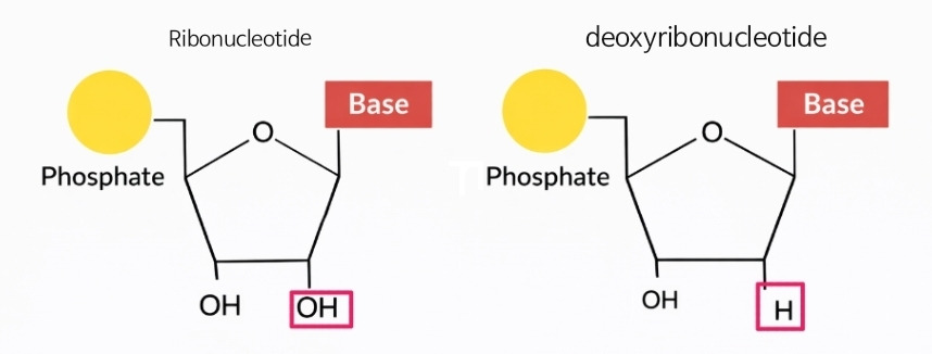 위의 그림에서 볼 수 있듯 RNA의 탄소 고리(ribonucleotide)에는 아래쪽 탄소에 모두 OH가 붙어있다. (OH는 각각 산소와 수소를 말한다.) 반면 DNA의 탄소 고리(deoxyribonucleotide)에는 오른쪽 아래 탄소에 O가 사라져 있다! 이 사소하고 아주 작아 보이는 차이가 어마어마하게 큰 차이를 만들어낸다.