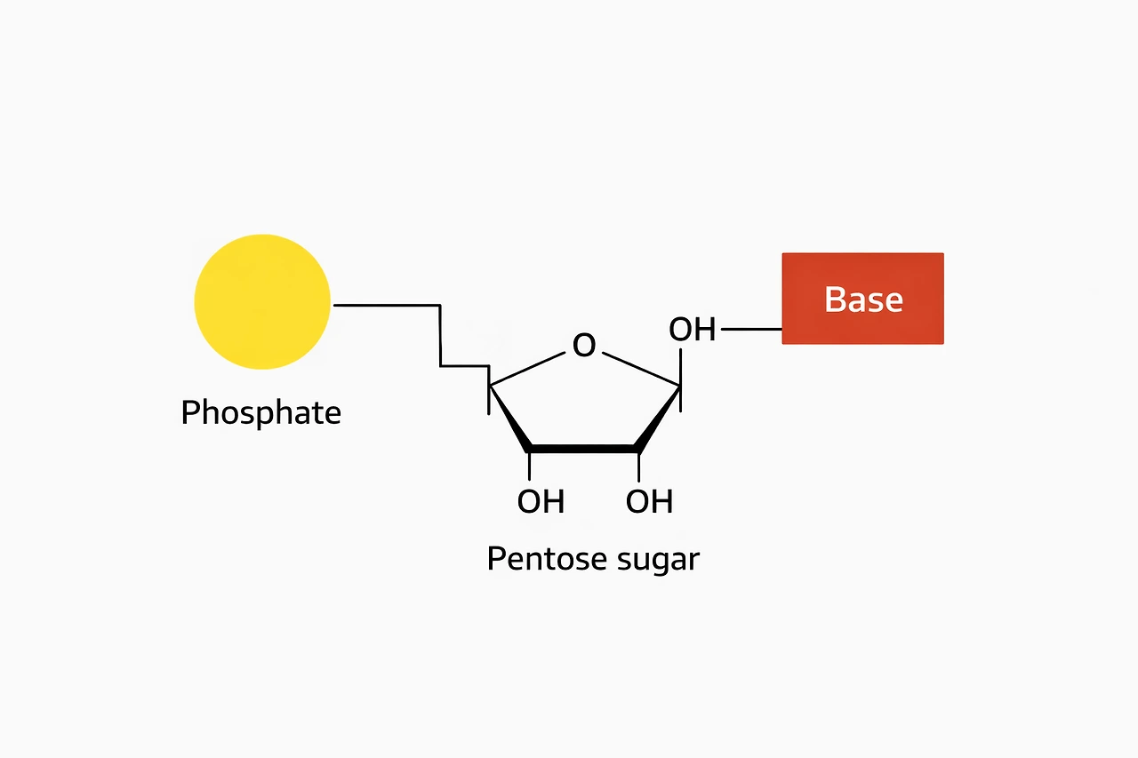 여기서 잠깐. 염기는 무엇이고 인산기는 또 무엇이란 말인가? 하지만 걱정하지 말라, 지금 필요한 건 복잡한 화학 구조가 아니다. 당분간은 그저 탄소 고리에 붙어있는 '부품' 정도로만 생각해도 충분하다.