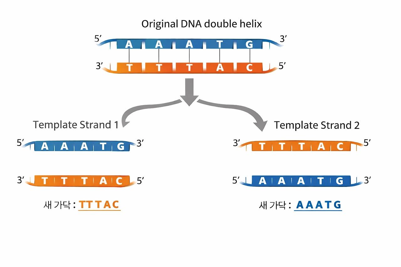 한쪽 서열이 AAATG인 DNA 한 가닥이 있다고 생각해 보자. 그럼 반대쪽 가닥은 당연히 TTTAC가 될 것이다. (기억나는가? A는 T와, G는 C와 짝을 이룬다.) 이렇게 염기쌍을 이루고 있던 DNA가 복제를 위해 벌려진다면, AAATG인 서열에는 TTTAC라는 서열이 붙어 하나의 DNA 이중나선을 이룰 것이다. 반대로 TTTAC라는 서열에는 AAATG라는 서열이 붙어 DNA 이중나선이 생길 것이다. 이처럼, DNA는 한 가닥이 주형이 되어 스스로를 복제할 수 있는 능력이 있다.