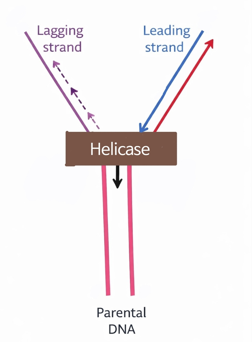 위의 그림은 헬리케이스가 DNA를 단일가닥으로 풀어나가는 그림이다. 지퍼가 아래쪽으로 내려가는 것이다. Leading strand(선도가닥)이라고 적힌 부분을 보면, 주형이 되는 가닥이 인산기가 '없는' 쪽에서 '있는' 쪽으로 풀리고 있다. 즉 합성되는 가닥은 인산기가 '있는' 쪽에서 인산기가 '없는' 쪽으로, 자연스러운 방향으로 합성되기 때문에 아무런 문제가 없다.
