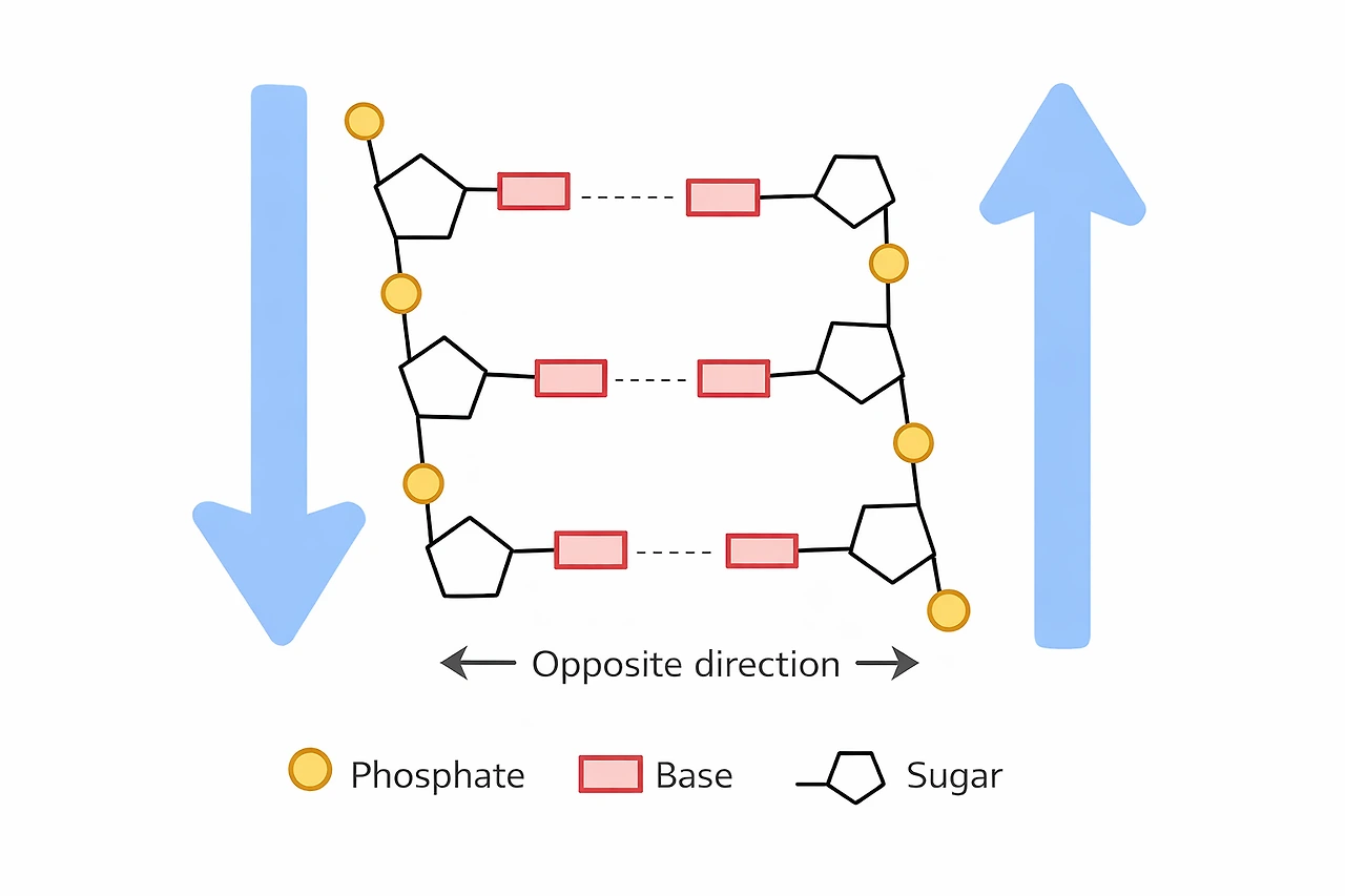 여기서 잠깐, 왜 서로 반대 방향을 이루는 것인지 궁금한 독자도 분명 있을 것이다. 이는 화학 구조와 관련된 부분이기 때문에 깊게 설명하지 않겠다. 서로 반대 방향으로 놓일 때 가장 안정적으로 이중나선을 이루기 때문에 결과적으로 역평행 구조가 된 것이라고 생각하면 된다.