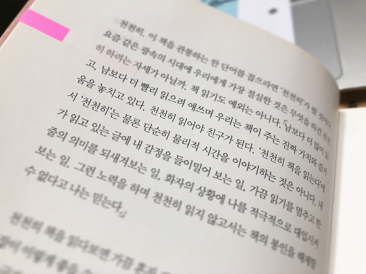 남보다 더 많이 읽고, 남보다 더 빨리 읽으려 애쓰며 우리는 책이 주는 진짜 가치와 즐거움을 놓치고 있다. 천천히 읽어야 친구가 된다. '천천히 책을 읽는다'에서 '천천히'는 물론 단순히 물리적 시간을 이야기하는 것은 아니다. 내가 읽고 있는 글에 내 감정을 들이밀어 보는 일, 가끔 읽기를 멈추고 한 줄의 의미를 되새겨보는 일, 화자의 상황에 나를 적극적으로 대입시켜 보는 일, 그런 노력을 하며 천천히 읽지 않고서는 책의 봉인을 해제할 수 없다고 나는 믿는다.