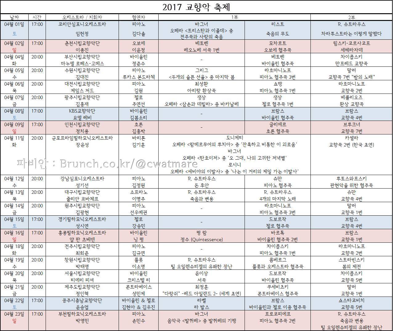 너무 낭만 후기와 러시아에만 치중한것 아닌지... 뭐 그래도, 교향악'축제'이니만큼 좀 가벼운 마음가짐을 가진다면, 춘천시향과 경기필, 전주시향, 충남도립이 클래식 입문자들에게는 편한 그나마 좀 편한 선곡이 되지 않을까 싶다. 강남심포니와 수원시향, 창원시향은 그에 반해 굉장히 칼을 열심히 갈(아서 선곡에 걸맞는 연주력을 보여줬으면 하는데)고 있나 보다.