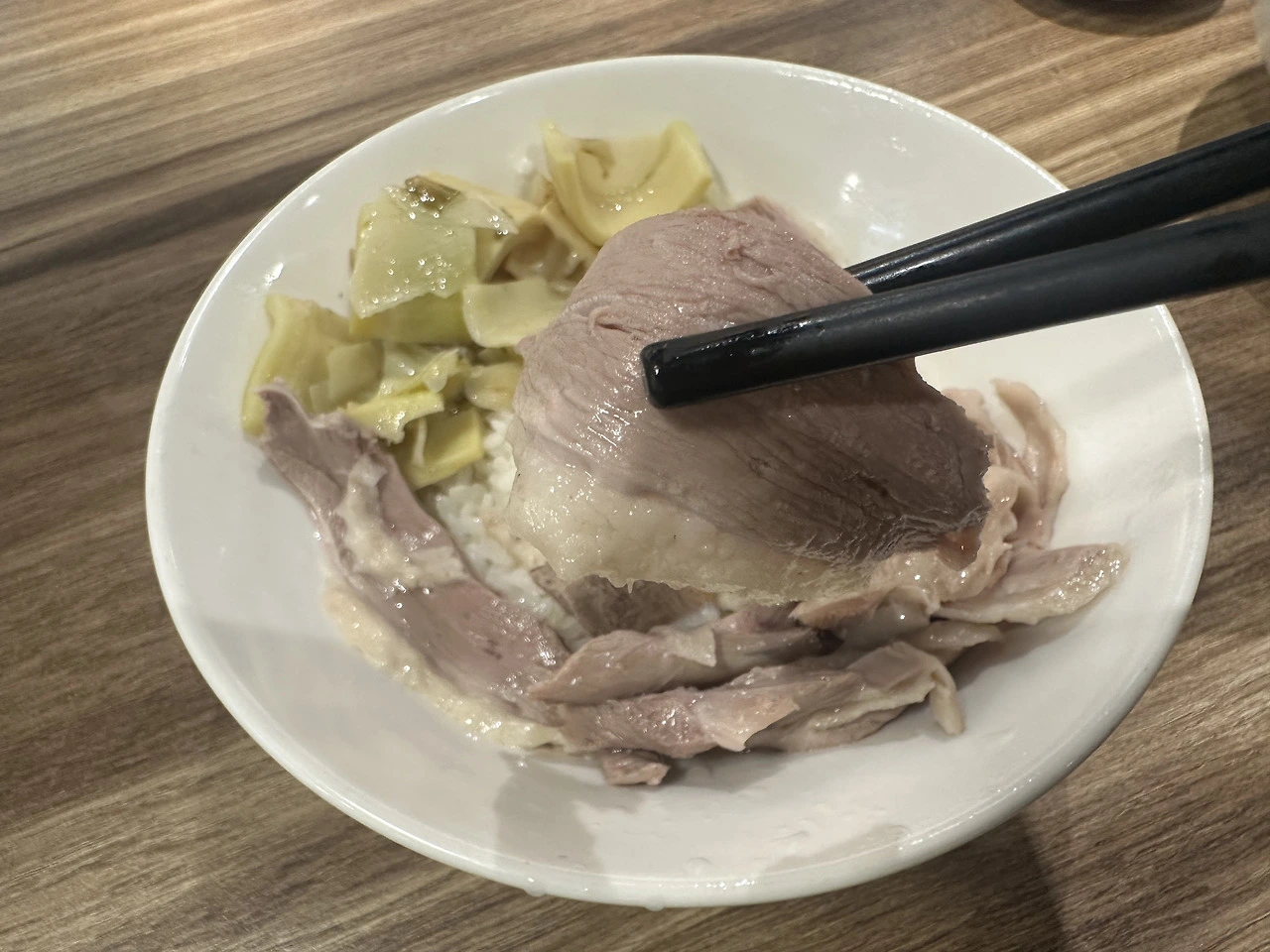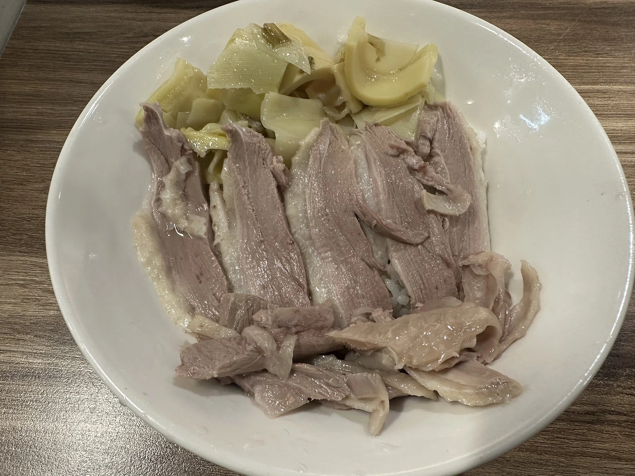 워낙 시스템화 계량화된 깔끔한 식당이다 보니 금방 나오네요. 모양이 그럴 듯합니다. 군침이 도는 걸 보니 우선 합격입니다. 밥위에 편으오 썰어있는 거위고기가 널찍이 덮혀 있습니다. 한쪽에는 죽순이 놓여 있고요.
