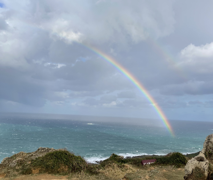 룽판공원에 도착해 마주한 태평양을 바라보니 신기하게도 쌍무지개다. 그것도 그 시작점이 바다 아닌가. 무지개 시작점을 본 경험도 낯선데 그 시작점이 바다 한 가운데라니. 신기했다. 설레는 마음에 서둘러 주차하고 내렸으나 빗방울이 굵어져 우선 다시 차로 복귀. 빗줄기가 다소 줄어든 틈에 다시 공원으로 향했다. 아직 무지개는 그대로다.