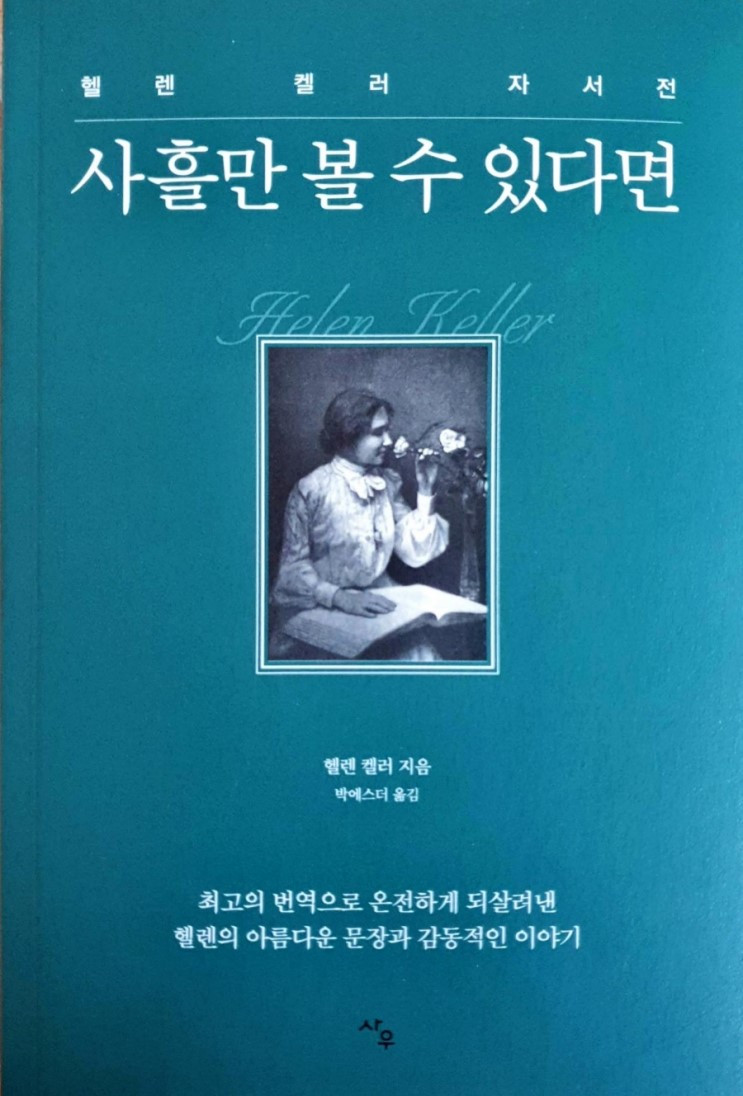 헬렌 켈러를 모르는 사람은 없다. 그러나 지나친 유명세 탓에 그녀의 삶의 이야기에 대해 간추린 내용을 알고 있을 뿐 뛰어난 작가인 그녀의 글을 자세히 읽어본 사람이 많지 많다. 그동안 어린이나 청소년이 읽기 위한 헬렌 켈러의 위인전이 나왔으나 주로 줄거리 위주로 발췌, 압축된 책이 허다했다. 정작 그녀의 보석 같이 빛나는 언어와 유려한 문장을 꼼꼼하게 번역한 글을 만나기가 어려웠는데 최근에 발간된 책 《사흘만 볼 수 있다면》(2018, 헬렌 켈러 지음, 박에스더 옮김, 도서출판 사우)을 발견했다. 이 책에는 헬렌 켈러가 23세에 쓴 <내가 살아온 이야기(The story of my life)>와 53세에 쓴 명수필 <사흘만 볼 수 있다면(Three days to see)>이 담겨있다. 세계적인 잡지 <리더스 다이제스트>는 이 에세이를 “20세기 최고의 수필”로 선정했다.