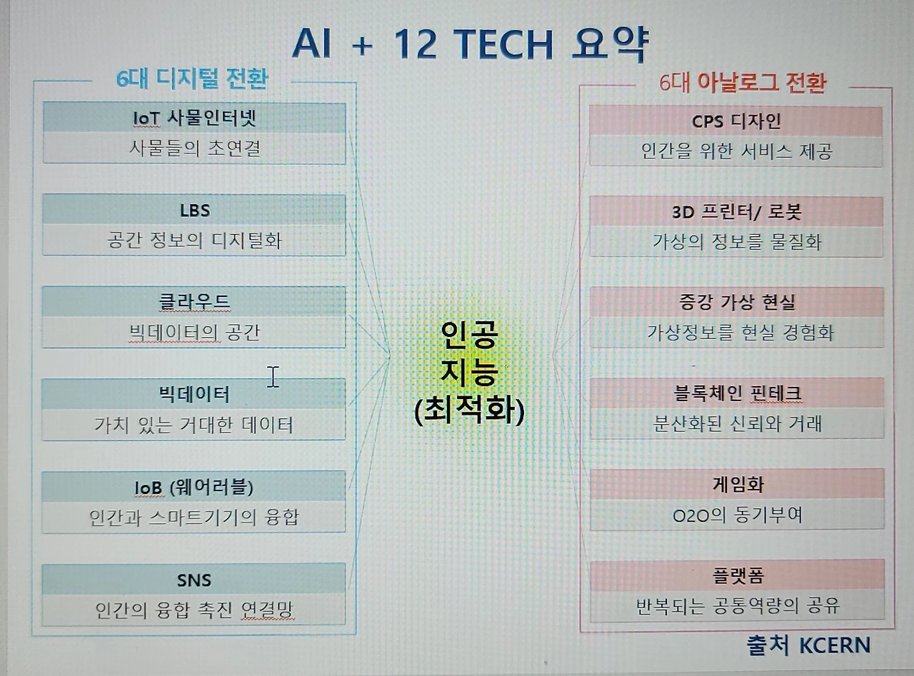 문득 4차산업혁명 강사과정에서 이민화 카이스트 교수가 만들어서 보여준 도표(AI+12TECH)가 생각난다. 쓰나미처럼 밀려오는 급격한 변화 속에서 인공지능과 온라인·오프라인의 기술이 결합하여 스마트트랜스포메이션 시대를 열어간다는 내용이었다.