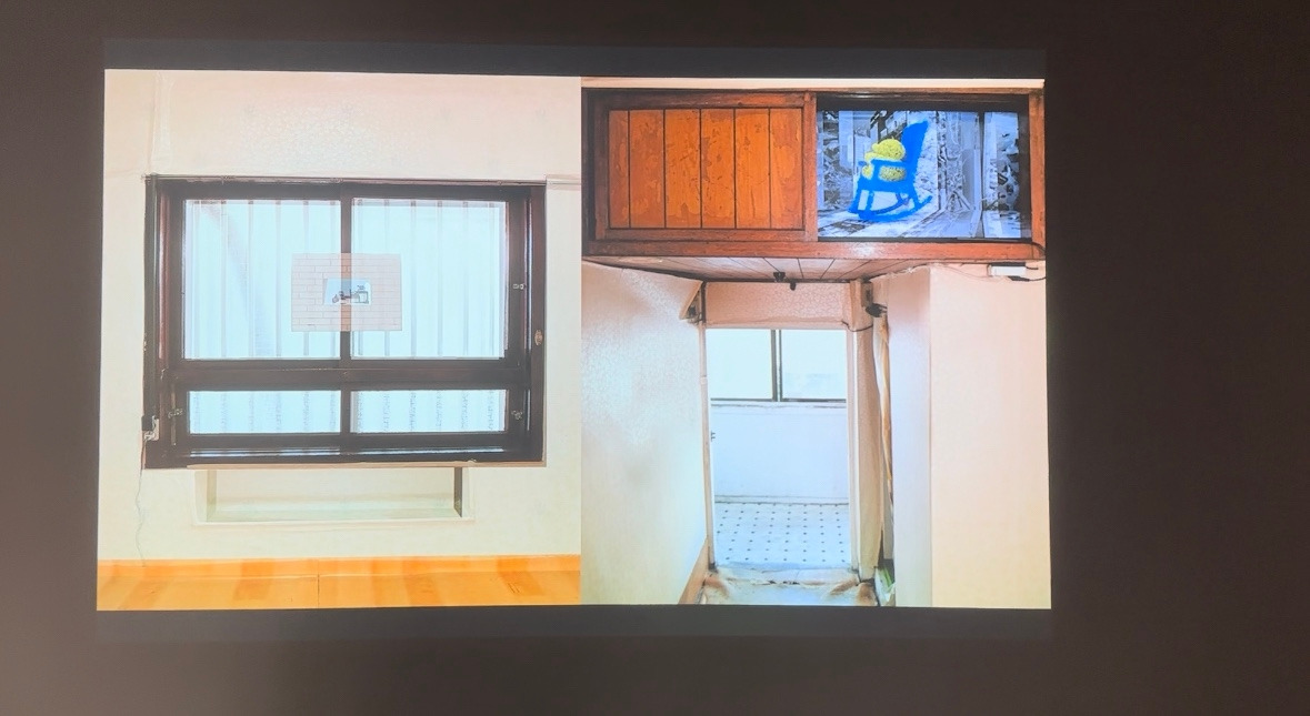 오정향 작가의 <기억 재생을 위한 환등상>은 관람객인 제가 발자국 위치에 서면 동작감지 센서를 통해 접근을 인식하고 영상이 구동된다. 이런 걸 인터랙티브 미디어라고 한다. 1960년대 대구 최초의 아파트 동인아파트를 볼 수 있는데 어떤이에게는 향수를, 어떤이에게는 호기심을 불러 일으킨다. 현재는 철거되어 사람들의 기억속에 있는 이 아파트를 사람들의 이야기와 기억을 통해 담아낸다. 우리 일상 속에서 보았을 법한 물건들을 풍경으로 등장시켰다. 이 작품 하나만으로 현재의 나와 옛 기억을 소환시키는 내가 함께 공존할 수 있다는 것. 시간의 흐름과 변화가 한 미디어 작품을 통해 나타난다는 사실에 주목해 볼 만하다.