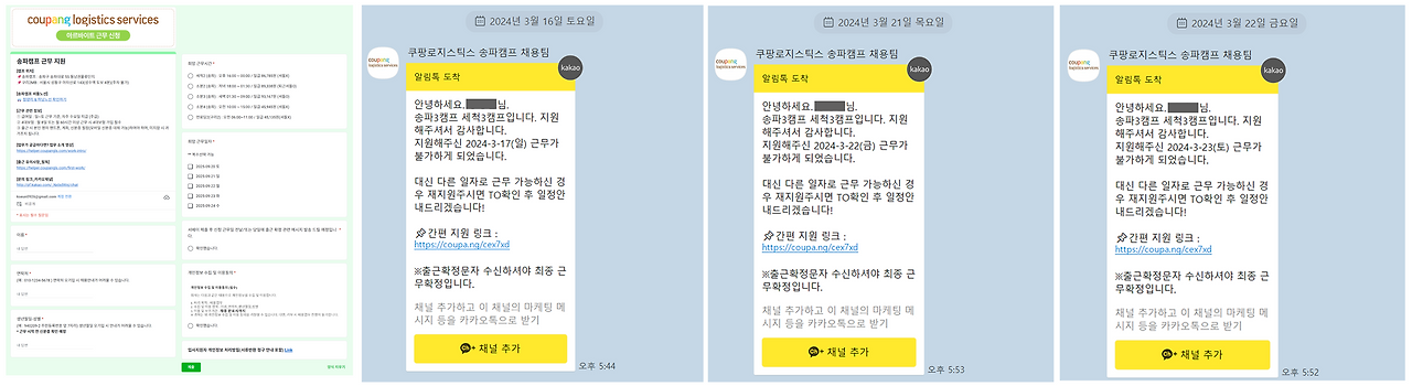 한편 채용팀을 통해 몇 번 근무하고 웬만히 일하는 수준이면 관리자가 '오픈채팅방'으로 초대한다. 한 번을 나가더라도 그 채팅방에다 요청하면 당일에도 근무할 수 있다. 나는 돈 값만큼의 책임감을 보여 얻게 된 기득권을 활용해, 한동안 '송파1캠프'와 '서초1캠프'를 오가며 원하는 날에 근무했다.