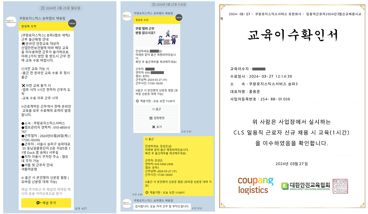 그러나 맘 같지 않게 3연속 근무불가 톡을 받았다. 일용직도 할 수 없는 상황인가 싶어 쪼그라 들었지만, 너댓번 까인 후에야 기회가 왔다는 알바후기를 봤다. 기다리니 네 번만에 근무확정! 이게 뭐라고 기뻤다. 공교롭게도 회사 퇴사 날이 쿠팡 첫 근무일. 퇴사서류에 사인을 하고 나오는데, 쿠팡채용팀 톡을 받았다. 일이 있다는 안도감으로 출근동의를 하고 온라인 안전교육부터 이수했다. 1시간 교육영상을 보고 문제를 풀면 된다.