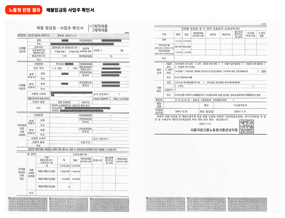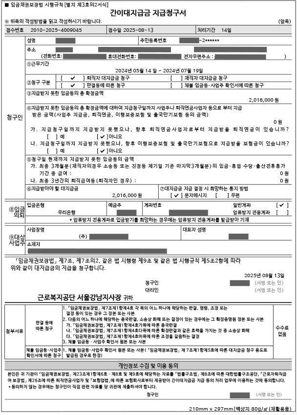 간이대지급금을 8월 13일에 신청을 했고 사흘 지나 담당자가 전화했다. 정보에 대하서 확인하고 승인되면 즉시 입금한다는 안내를 받았다. 실제로 다음날인 8월 19일 체불임금등사업주확인서에 확정된 금액 2,016,000원이 입금됐다. 소송에 7개월이나 걸렸는데 대지급금은 일주일도 되지 않아 들어왔다.
