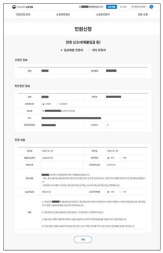 온라인으로 민원신청 하거나 관할 지방노동청에 직접 방문해 진정서를 제출하면 된다. 나는 고용노동부 노동포털에서 온라인으로 진정을 제기했다.