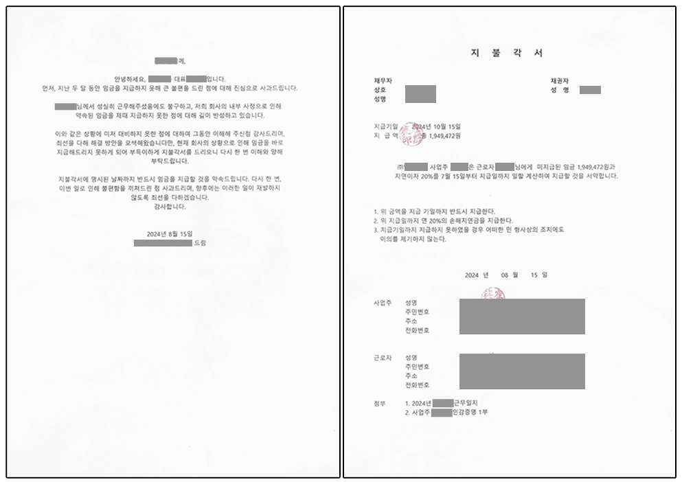 게다가 이 업장 이전의 카페사업장에서도 유사한 진정 및 고소가 여러개 진행 중이라는 정보도 들었다. 따지기도 애매한 200만원 내외의 임금액을 의도적으로 체불시킨 후 사정이 어렵다는 이유로 해고하기를 반복한 것으로 이해됐다. 갚을 의사가 없으면서 지불각서까지 보내며 속였다는 생각이 들어 괘씸했다.