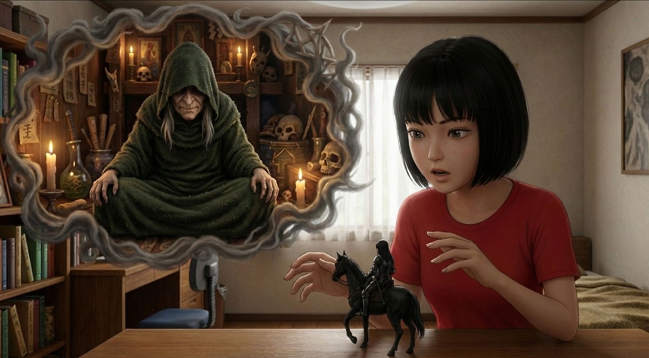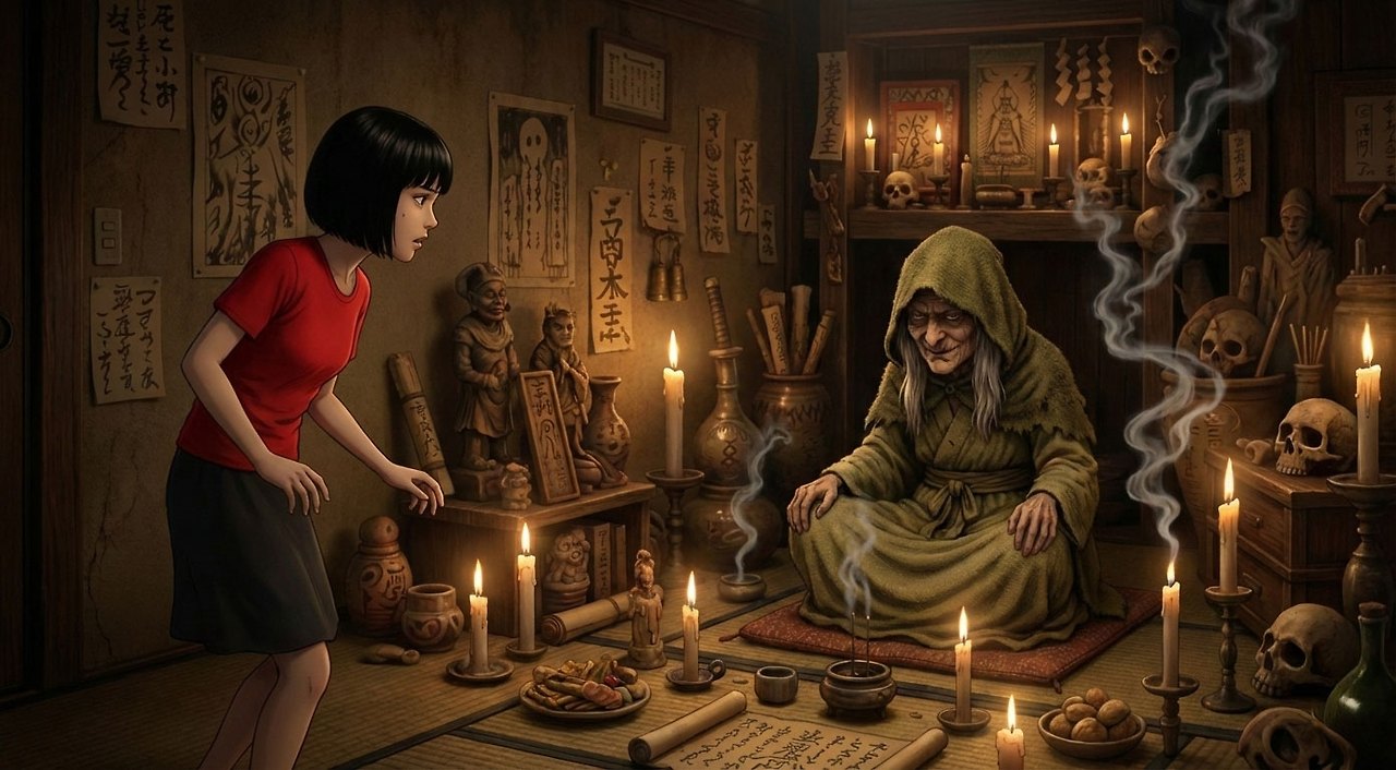 마녀는 숲속의 불길한 작은 법당에서 기묘한 미소를 지으며 소녀를 맞이했다.