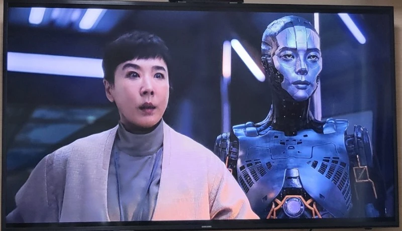 그러고 보니, 강수연 배우를 비롯해 연구진들이 입고 있는 옷도 개량식 한복 같았다. 한국식을 겨냥한 감독의 큰 그림이었을지 모르나, BTS 정국이 입은 모습과 사뭇 다른 핏이었으며 최첨단 SF 영화의 의상과 걸맞지 않았다는 생각이 든다. 의상마저도 아쉬웠다.