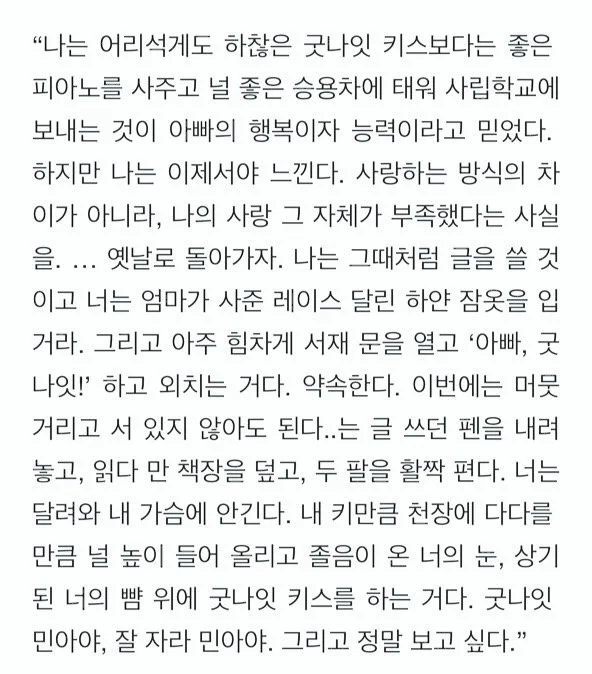 이어령 장관의 <딸에게 보내는 굿나잇 키스>의 한 구절이 영화와 맞물려 떠오른다. 책과 방송으로 만난 분들이지만 장녀 이민아 목사와 이어령 교수가 편안함에 이르길 바란다.