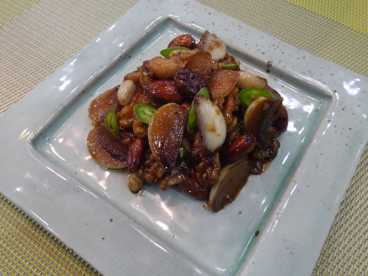 1. 깐 마늘은 두툼하게 편으로 썰고 견과류는 깨끗이 씻어 준비한다.