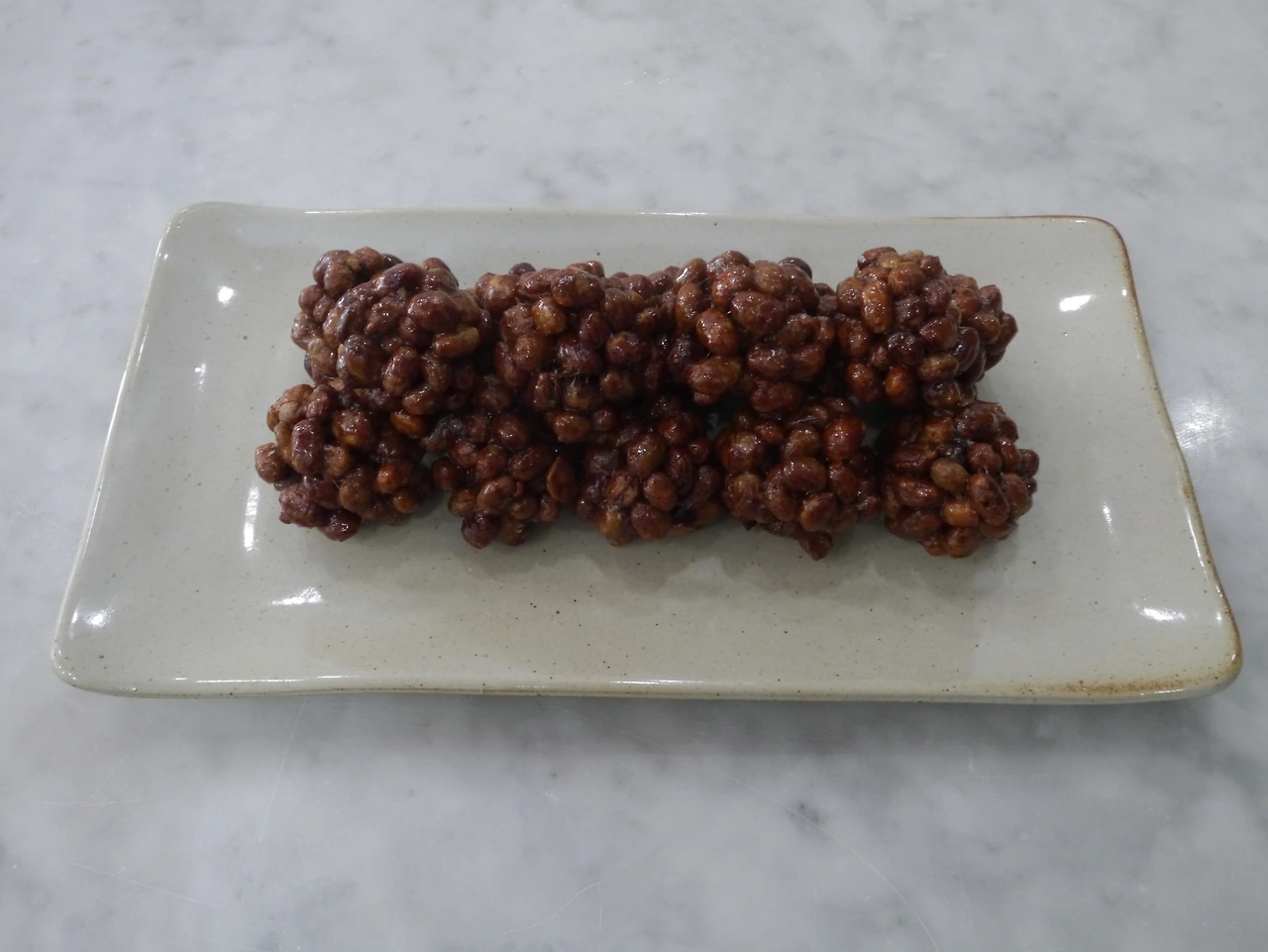 6. 달궈진 팬에 시럽 3T를 넣고 끓이다가 실이 나면 튀겨놓은 청국장 1C을 넣어 버무린 다음, 따뜻할 때 적당한 크기로 동그랗게 만든다.