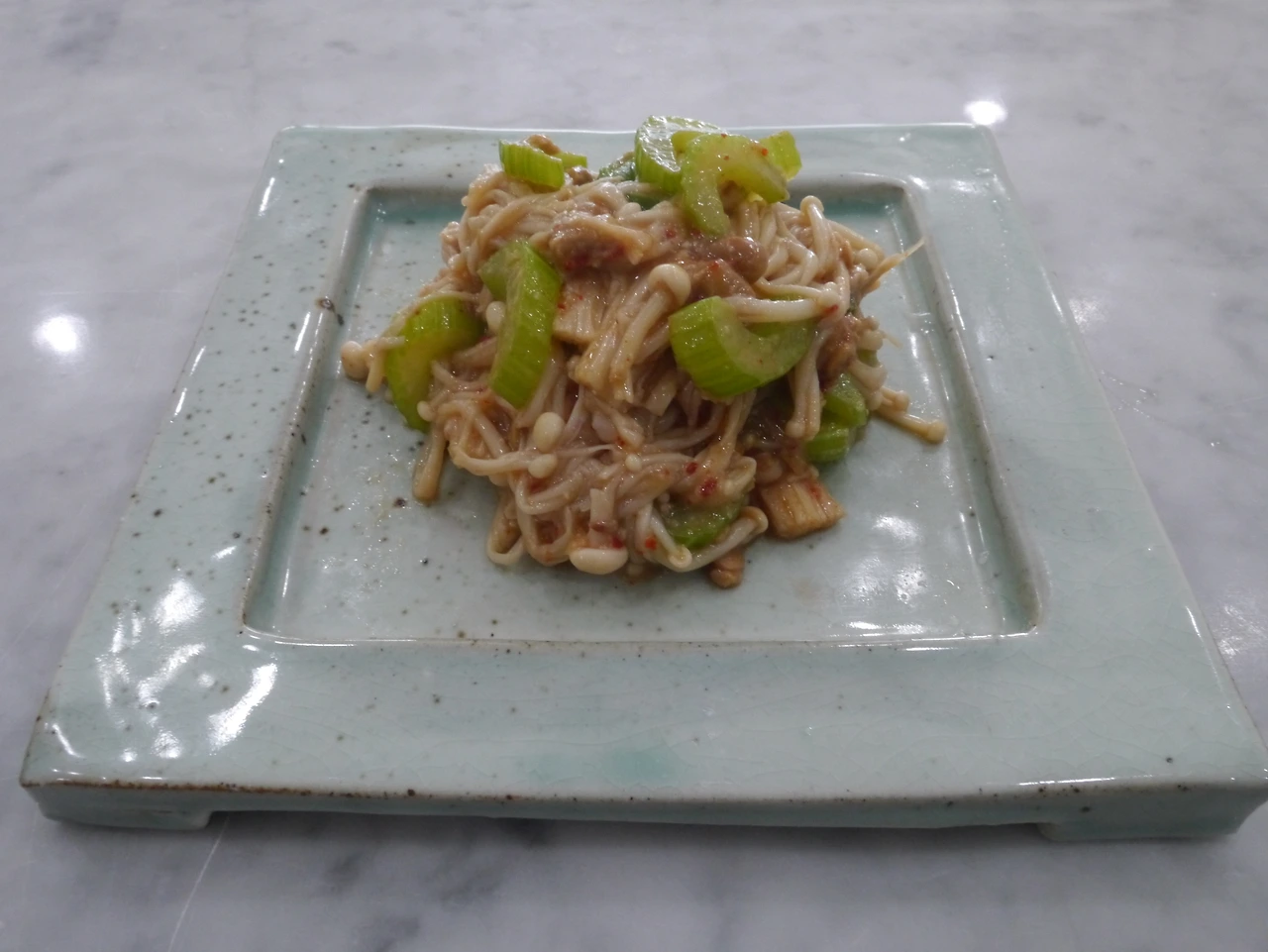 4. 팬을 달궈 식용유를 두르고 준비한 대파와 풋고추, 다진 마늘을 넣어 볶다가 향이 나면 센 불에서 셀러리를 먼저 볶는다. 셀러리가 파랗게 되면 팽이버섯을 넣고 재빨리 볶는다.