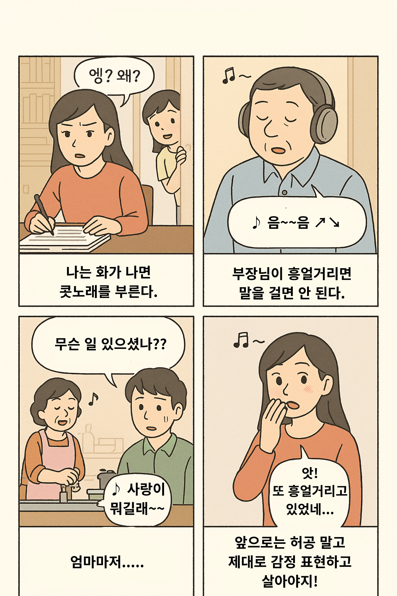 그렇다. 나는 화가 나면 콧노래를 부른다. 화가 나는 상황에 직면하면, 내가 억울한 상황이라면 더더욱 그 자리에서 감정을 드러내야 했다. 나의 건강을 위해서, 그리고 상대방에게 무언가 잘못되었음을 알려주기 위해서.