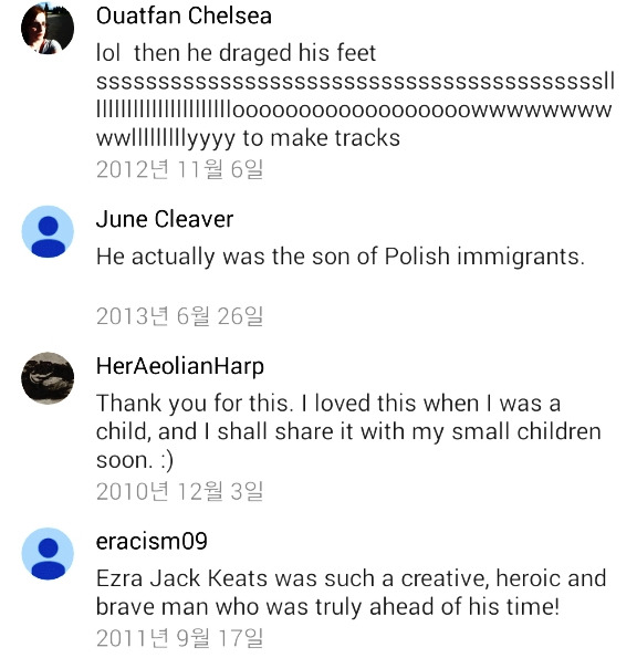 좋은 동화책의 위력을 실감하는 오늘이다. 이 책은 출판된 지가 50년이 넘었다. 잭 키츠의 아름다운 그림과 정감 넘치는 스토리 그리고 당시에 처음으로 그림책 African American인 흑인아이를 주인공으로 삼아 이슈거리였다고 한다.