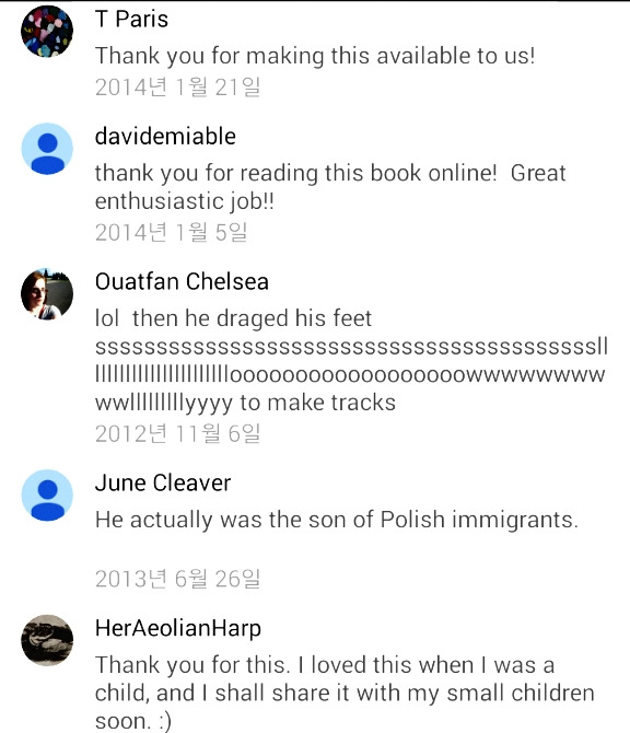 아주 오래전에는 책과 CD를 구입하여 읽어야 했지만 최근에는 온라인으로 누구나 듣고 볼 수있는 동화책이 많다. 우리 모녀처럼 느꼈던 몇몇의 댓글로 감동을 대신한다.