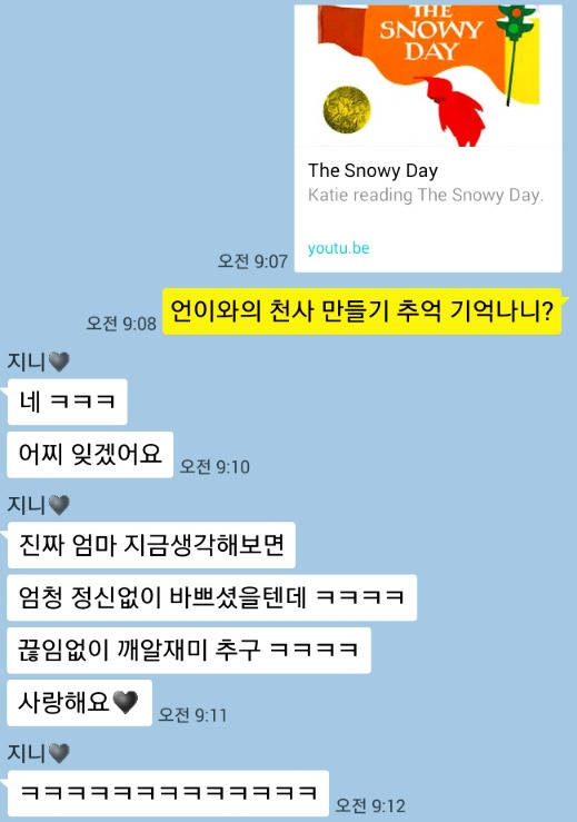 한창 아침 근무 중인 큰 아이와 오래전 함께 좋아했던 동화책 '눈 오는 날'이야기를 잠시 나눴다.그날은 아이가 집에서 좀 먼 곳으로 공부하러가던 길이었다. 스노체인이필요 없는 따뜻한 남쪽에 살던 내게 몇 년 만에 내린 폭설은 당황스러웠다. 계속 바퀴가 헛돌고 있어 더 이상운전을 할 수 없었다. 나는 차를 조심히 몰아 안전한 곳에 세워두고 아이를 내리게 했다.