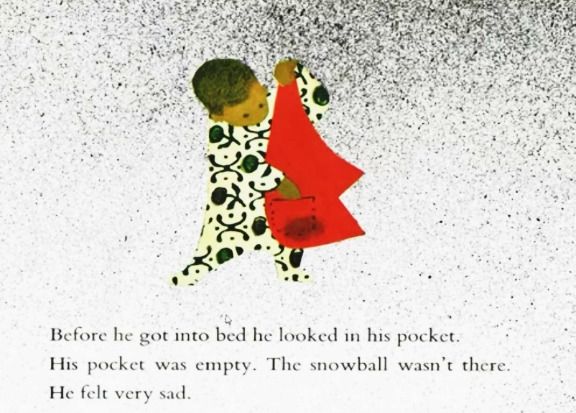 이 책에는 특별히 사랑러웠던 부분이 있다. 아이는 태어나 처음 눈을 보게 되어 신기한나무지 주머니 가득 눈을 담아온다. 하지만 눈이 녹아버린 줄을 알지 못하고 주머니를뒤지며 슬퍼하는 장면이다.