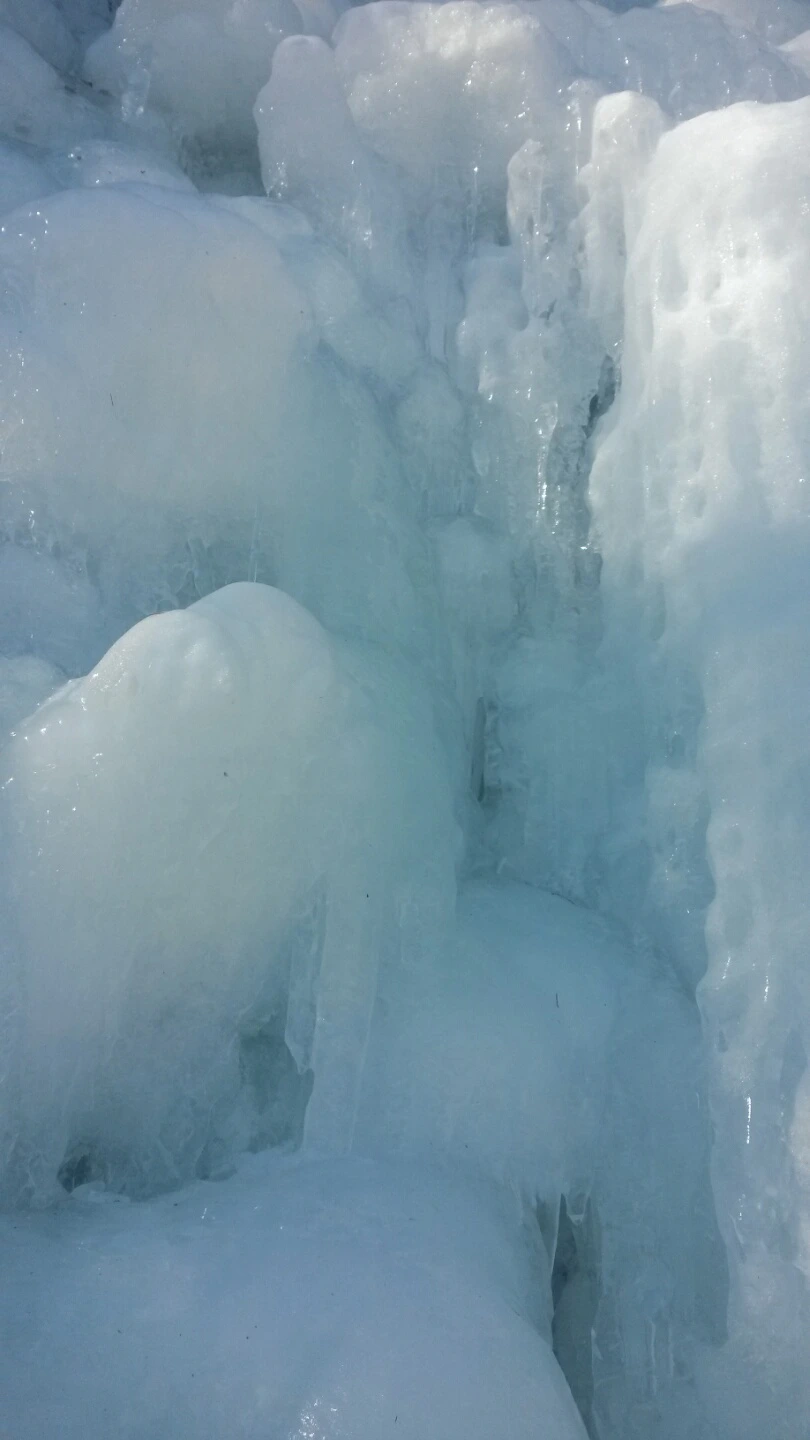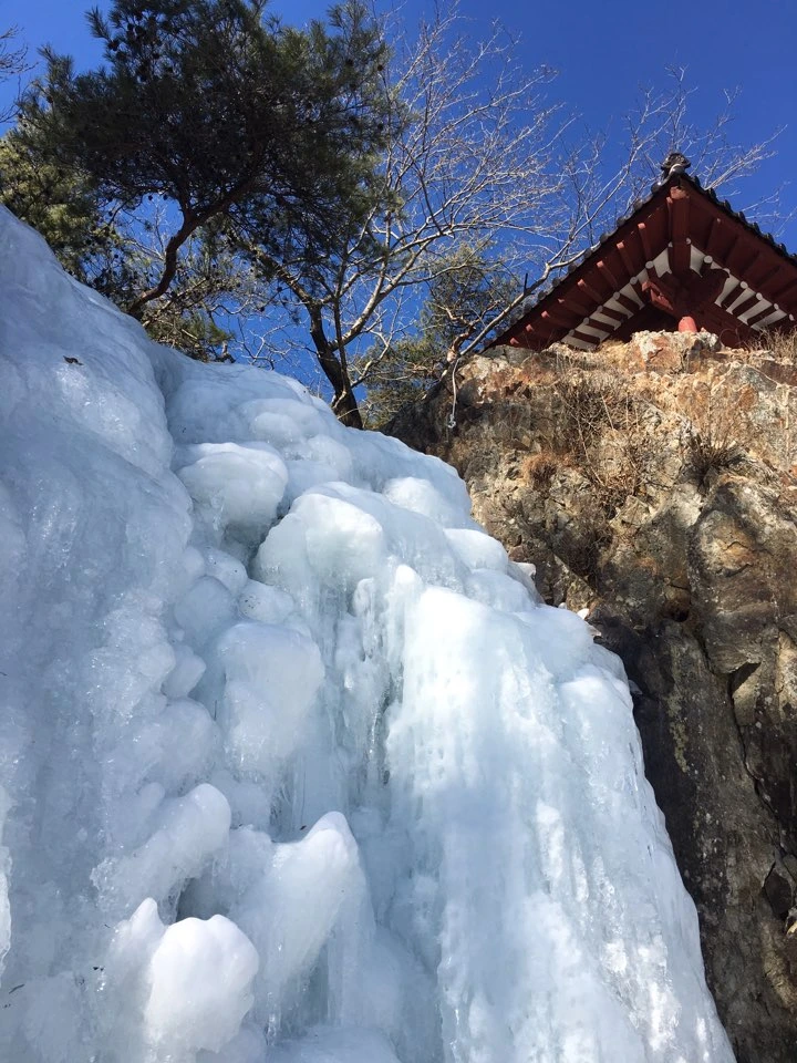 폭포 얼음 뒤의 물살은 여전히 세차고 힘차다.