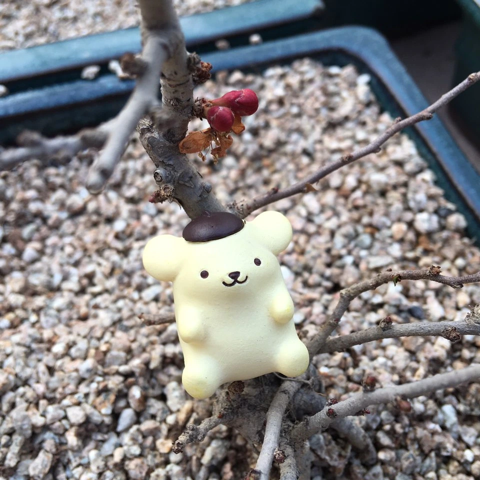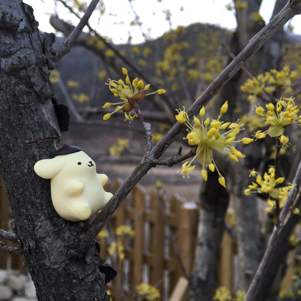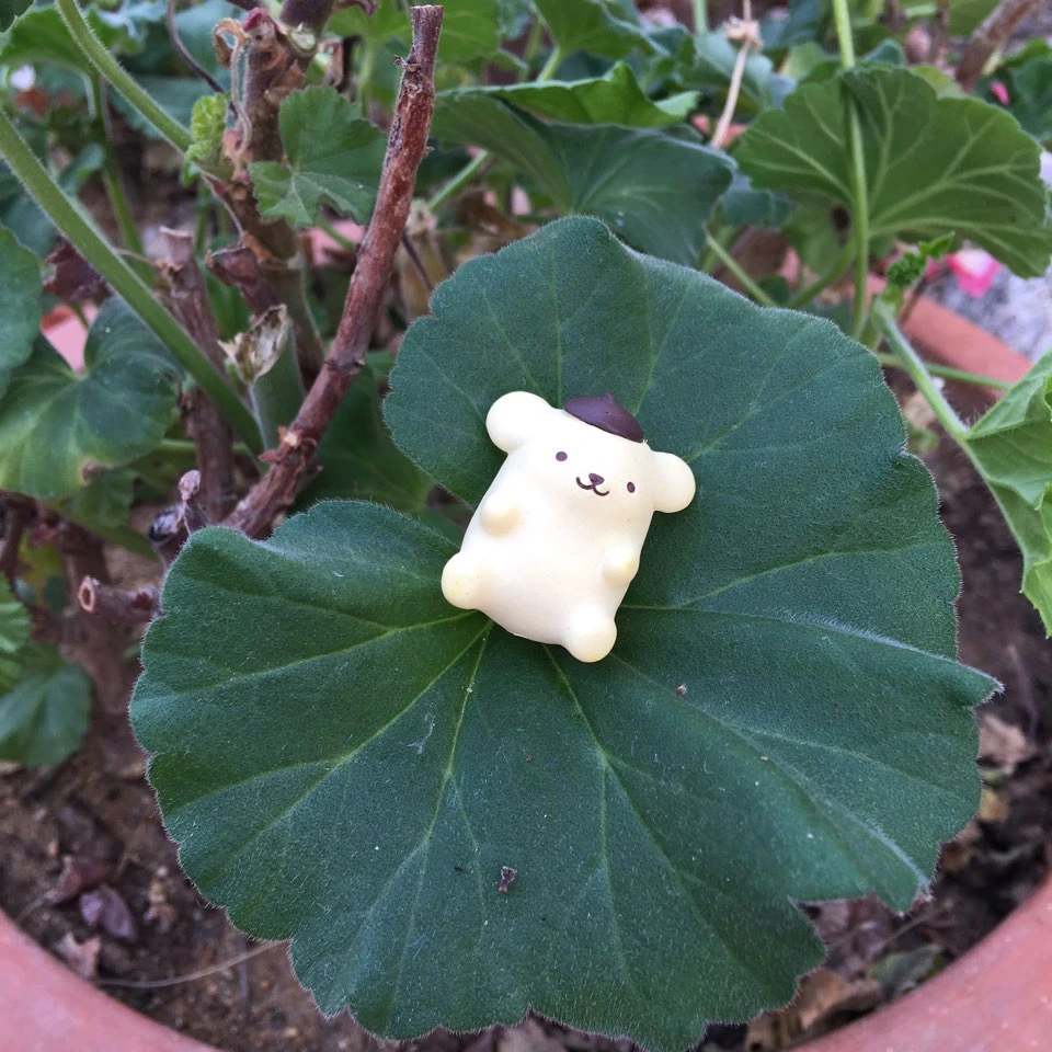 산수유와 제라늄 잎 위에 앉은 작은 푸린