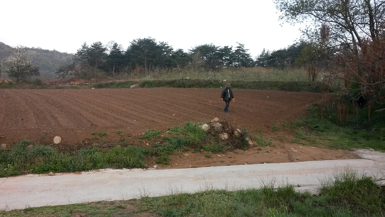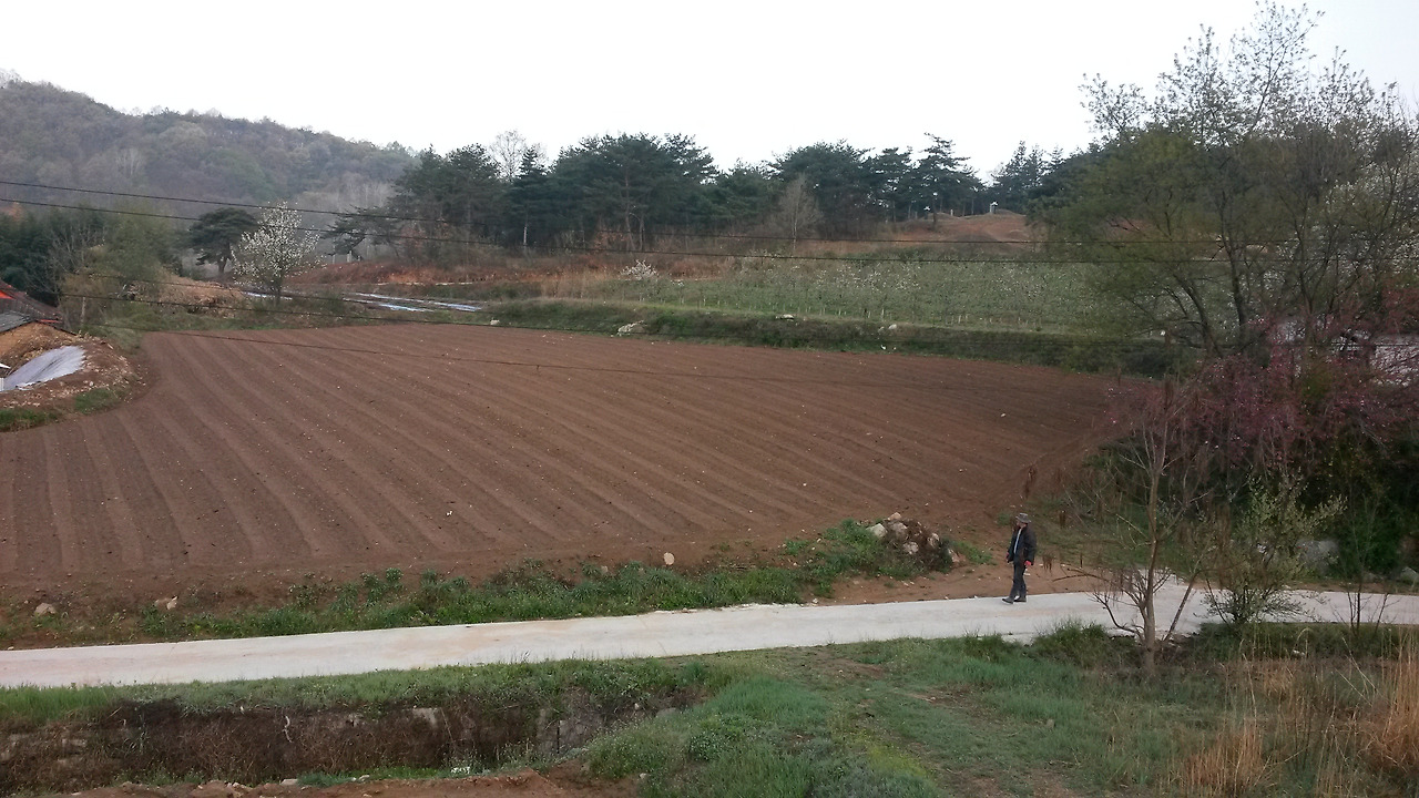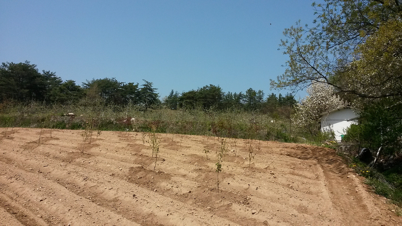 새벽 5시! 얼떨떨한 상태로 커피를 마시고 열무비빔밥까지 먹고는 집을 나섰다. 오래전에 계획하여 주문했던 묘목은 6시 30분에 정확히 배달되었다. 땅을 고르고 이랑의 넓이를 정하여 마을분께 로터리를 부탁해 놓았더니 삽과 호미만으로도 나무를 심을 수 있을 정도로 땅이 포실포실하다. 낯선 마을은 아직 잠들어 있다.