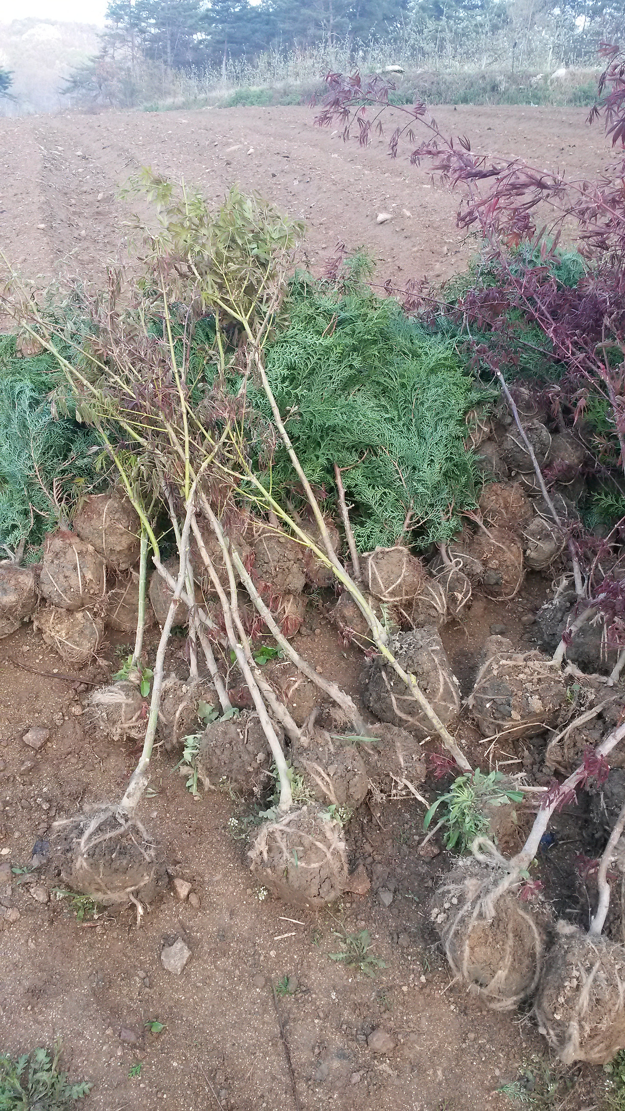 때문이다. 해서 작게나마 묘목이 자라던 제자리 흙으로 뿌리를 감싼 '분'을 떠야 한다. 편백나무에 이어 청단풍 홍단풍 이팝나무 느티나무 복자기 벚꽃나무는 뿌리에 흙덩이 하나씩을 매달고 트럭에서 내려졌다.