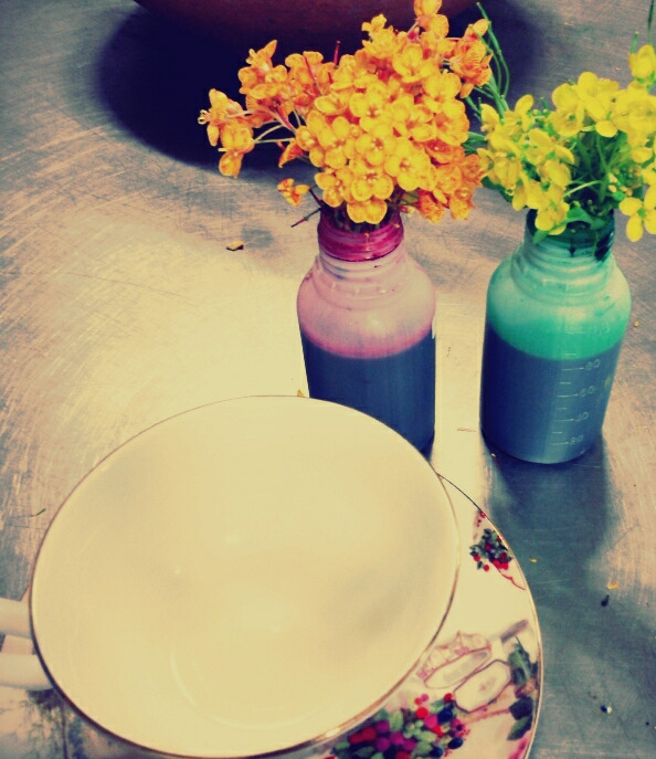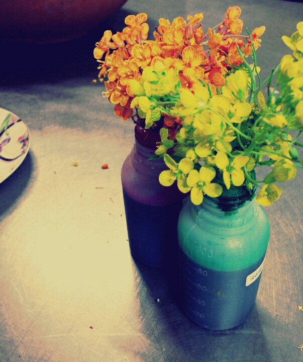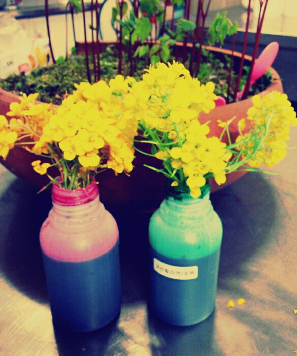 에 담근 꽃은 주황색으로 초록액에 담근 꽃은