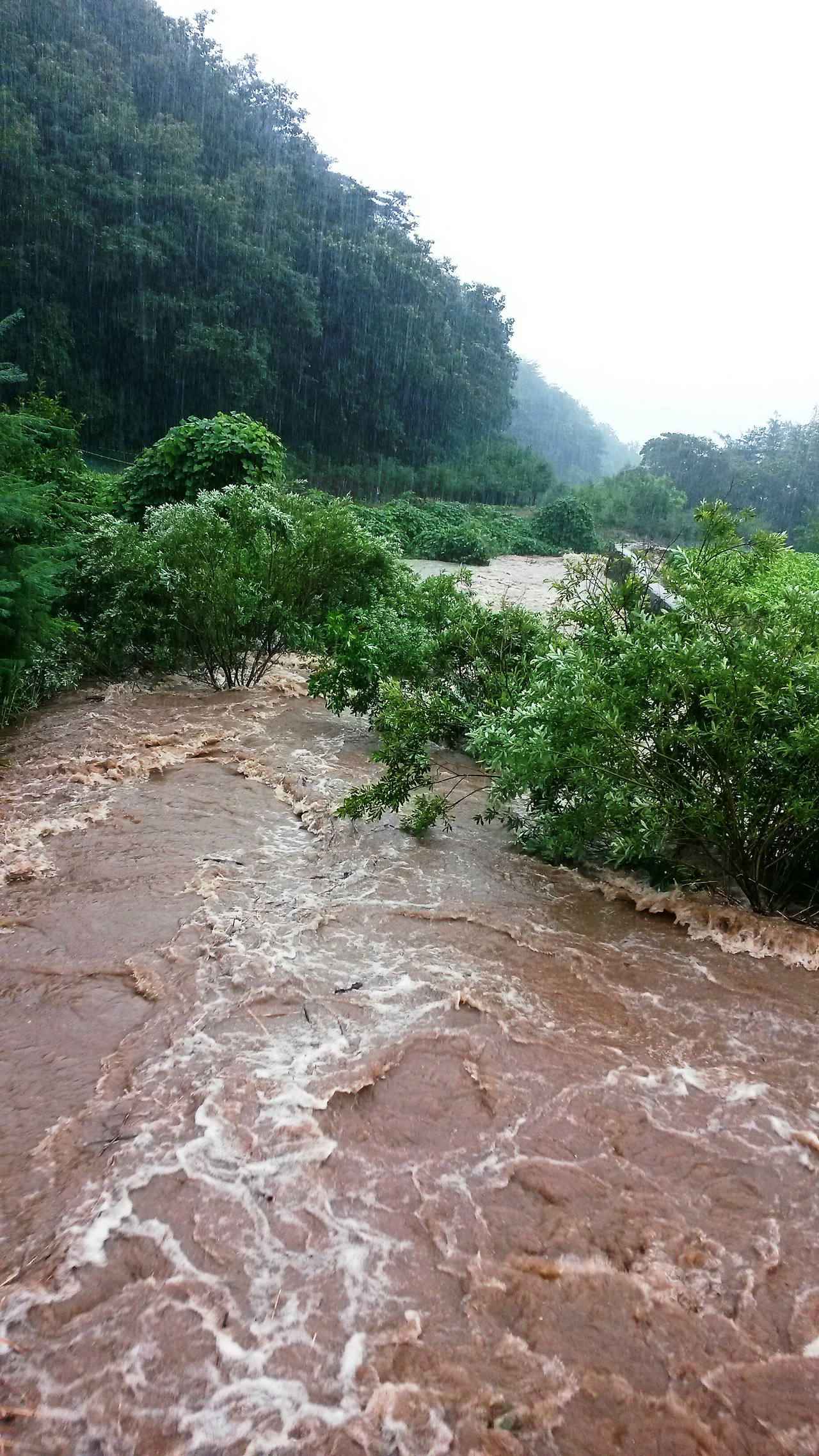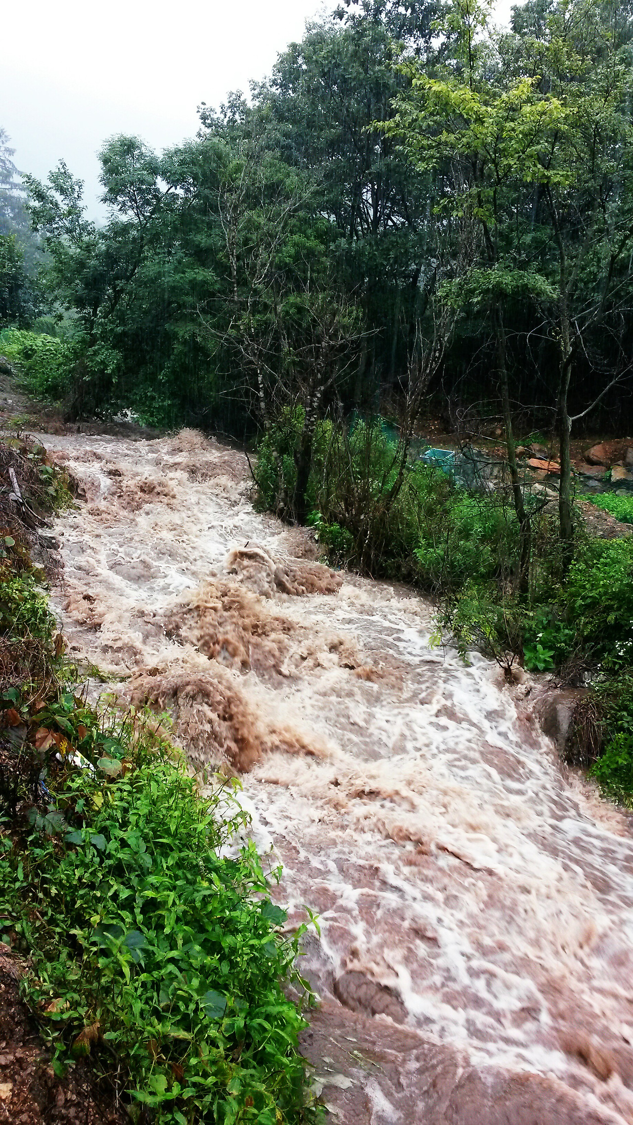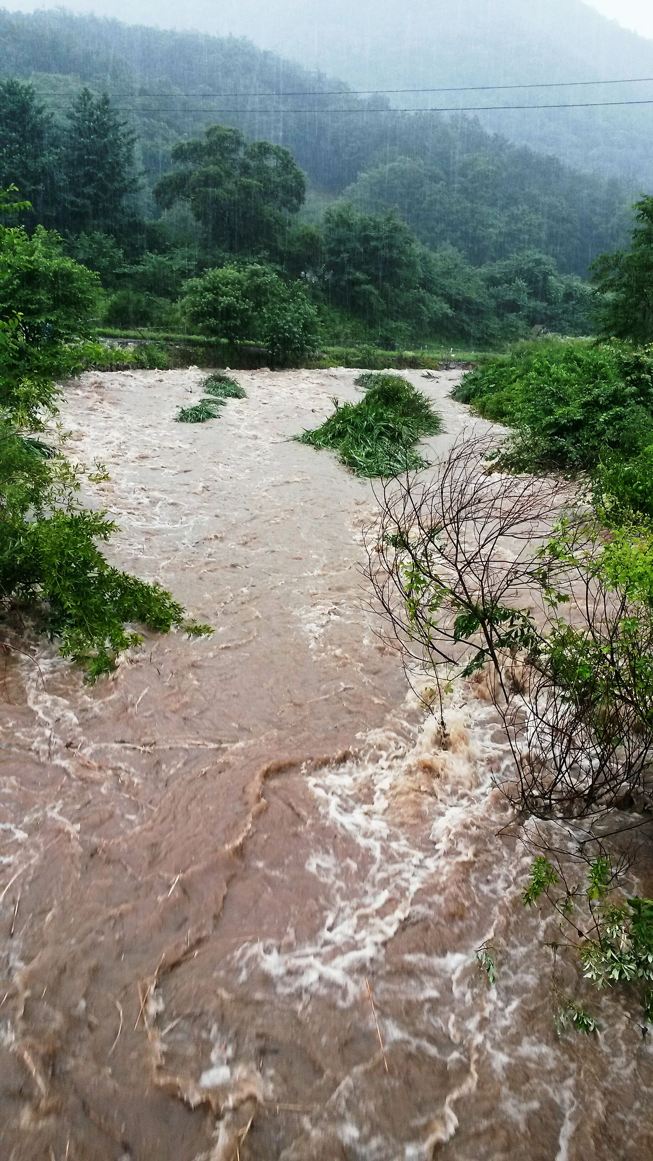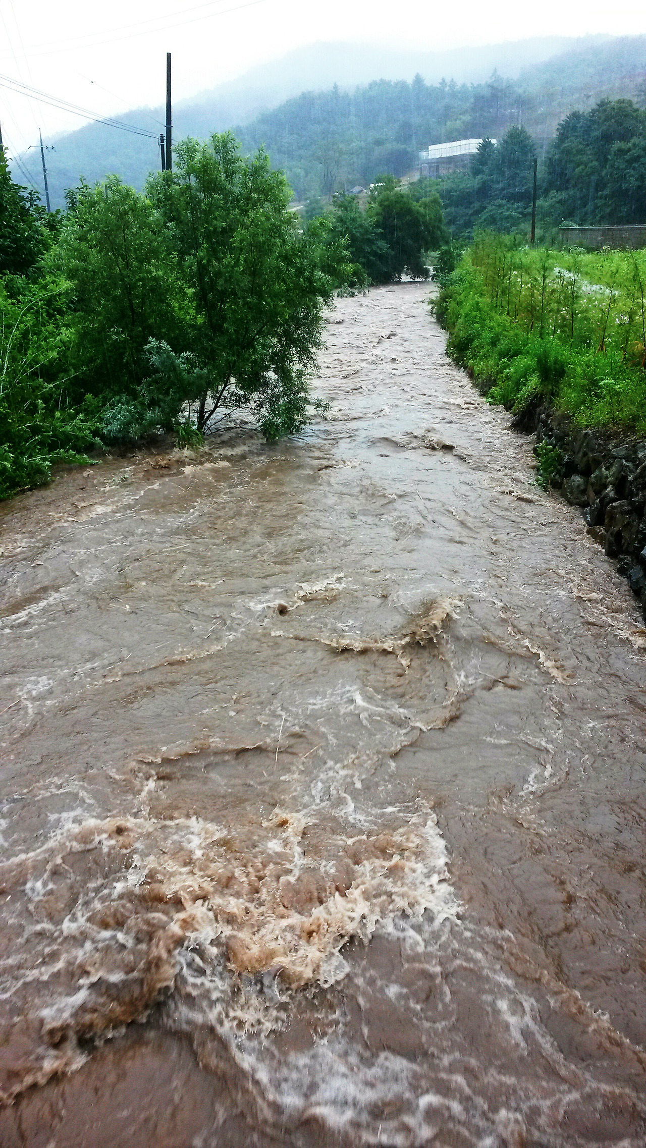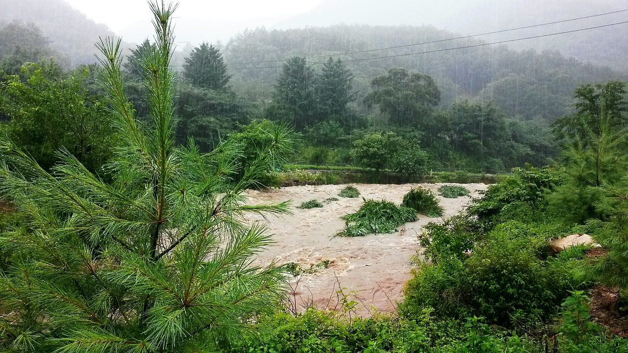 계곡물은 줄어들었다. 흙탕물은 좀 시퍼레졌다.