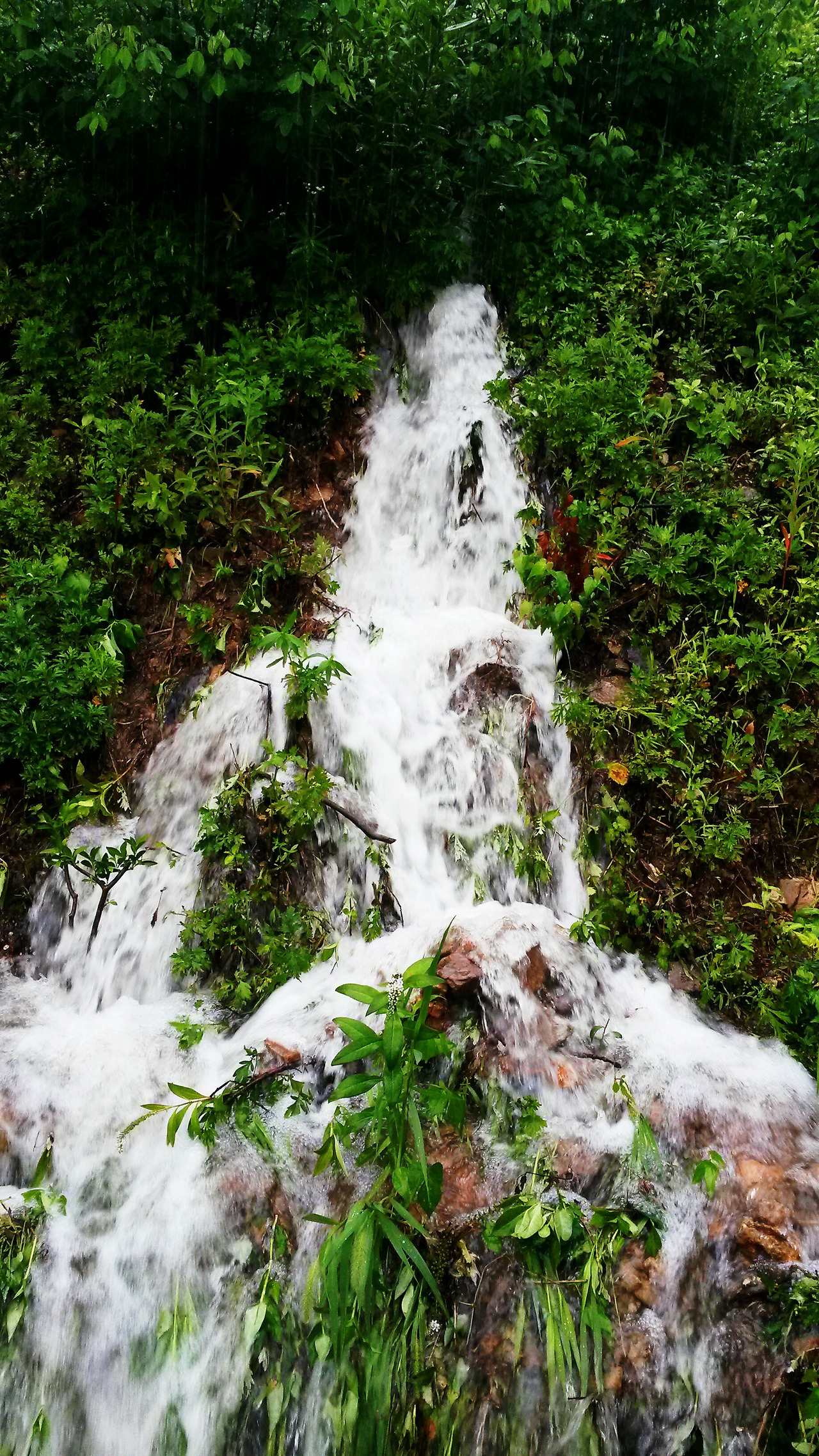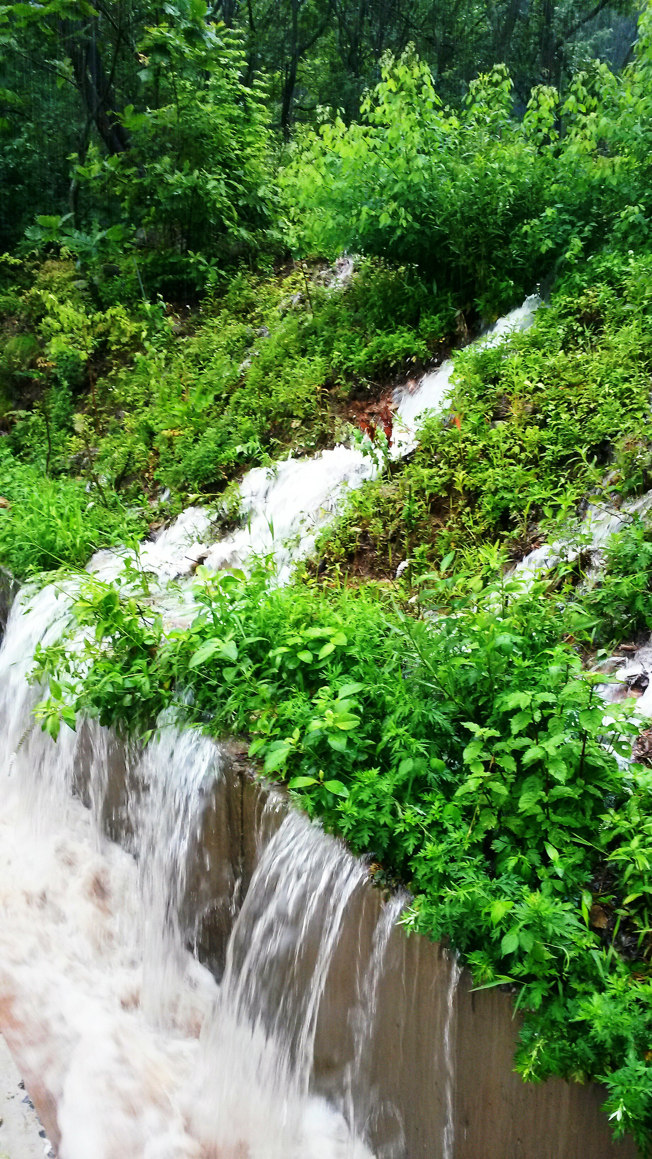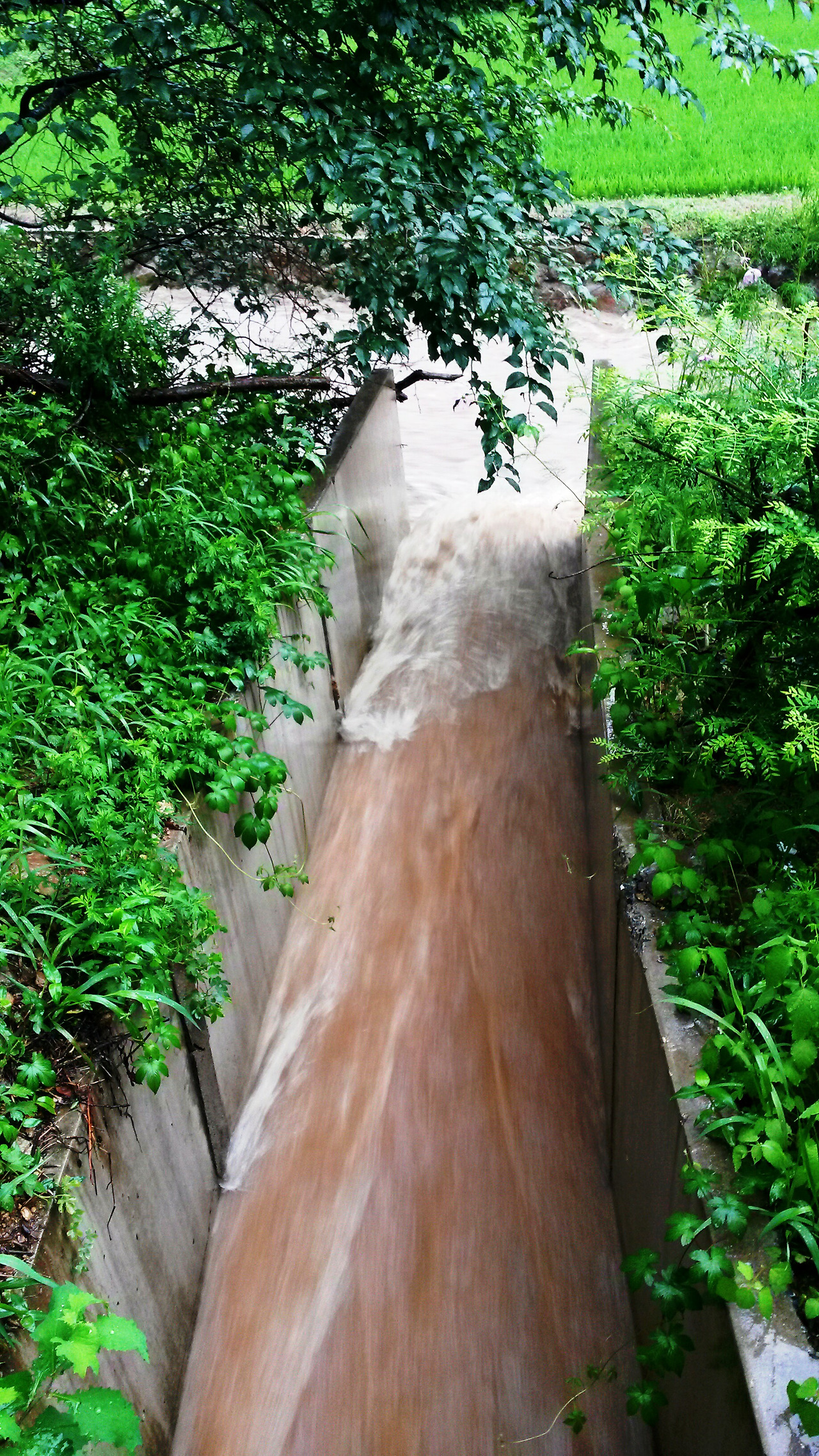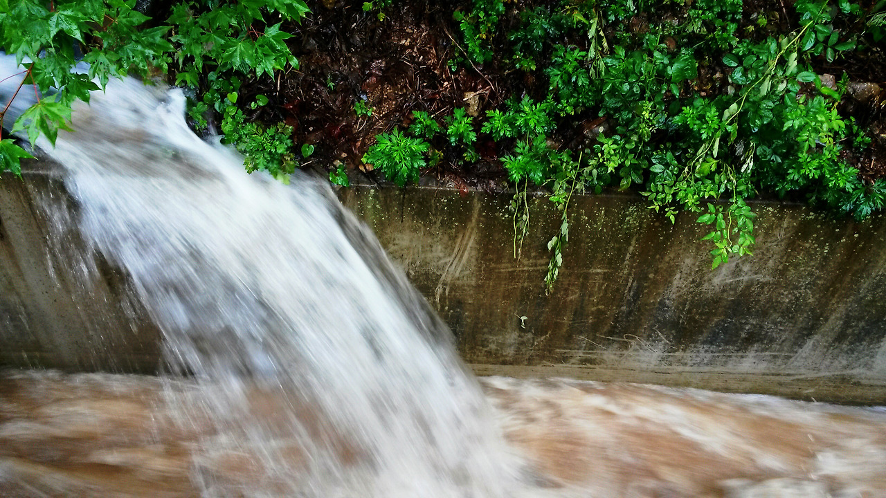 수로 속으로 쏟아지는 물은 작은 폭포를 이루고