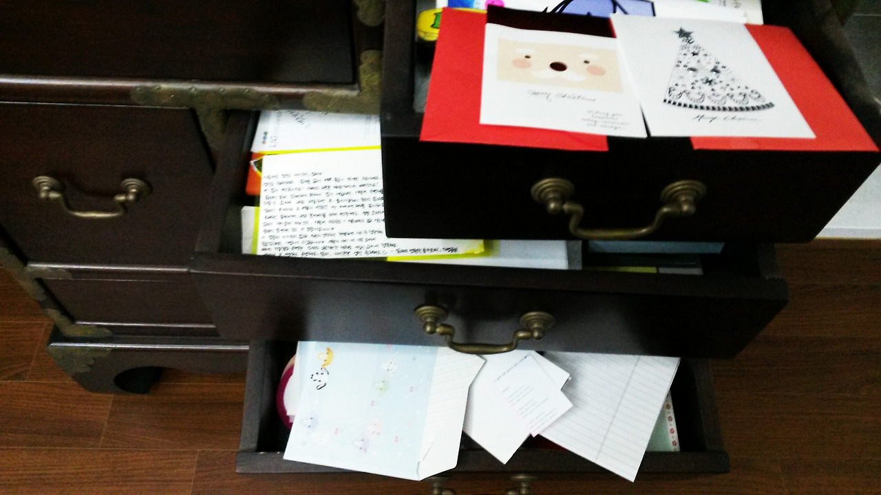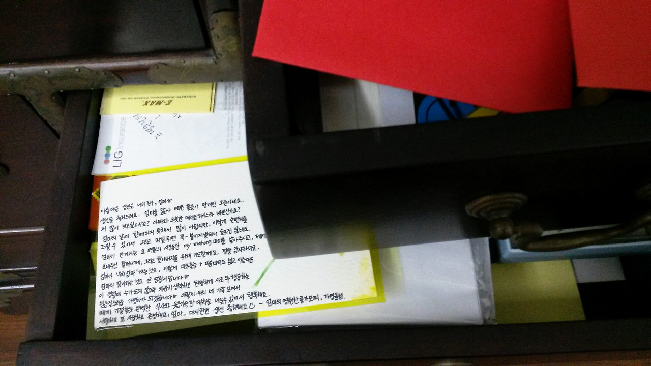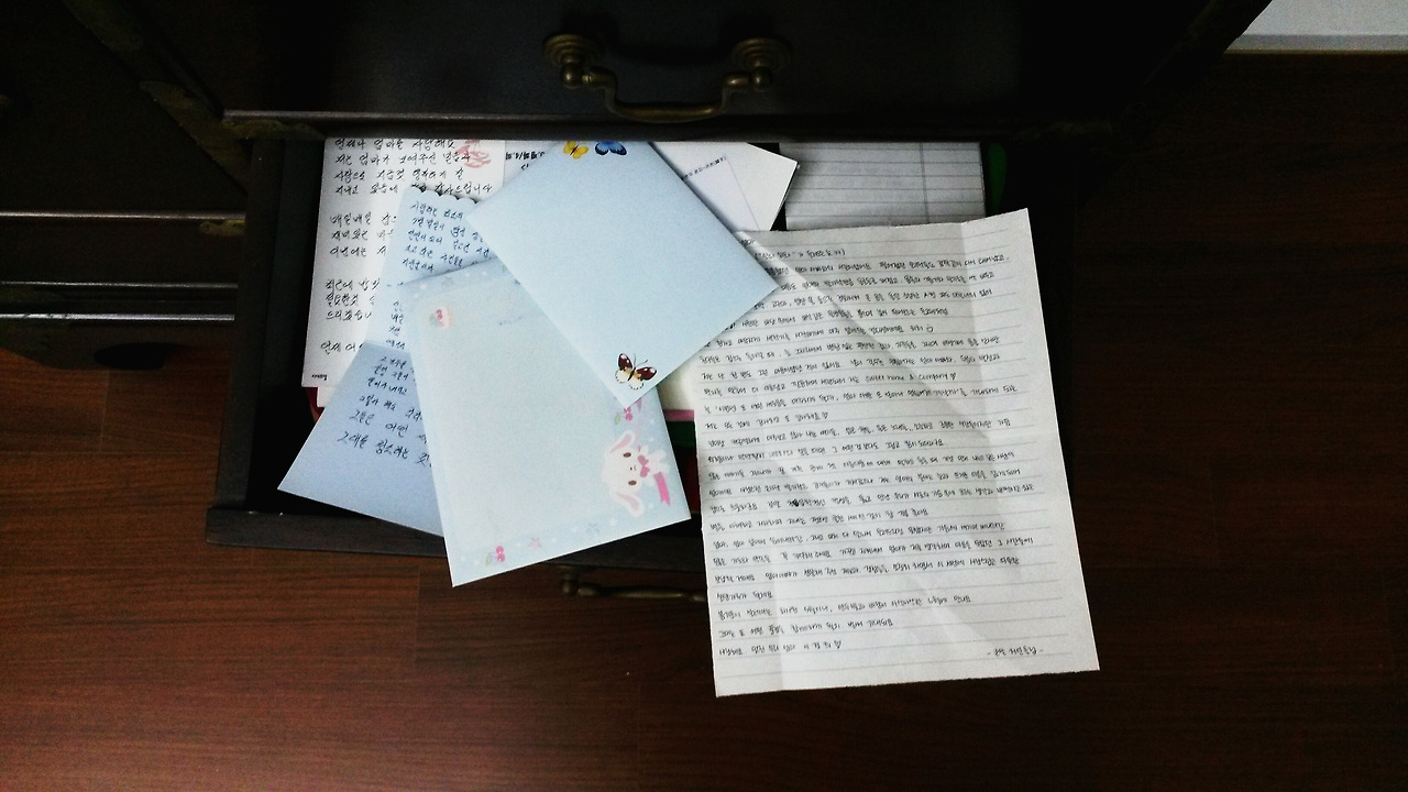 서울에서 올 아이를 기다리며 '편지 서랍'을 연다. 오랫동안 만나서 헤어질 때, 혹은 중요한 날! 마음을 다해 서로에 대한 느낌을 주고받았던편지들이 쌓여있다. 표현한 만큼의 친밀함과믿음이 쌓였음을 서로가 서로에게