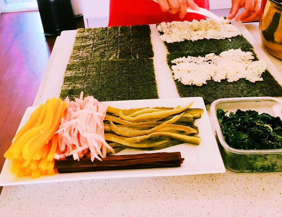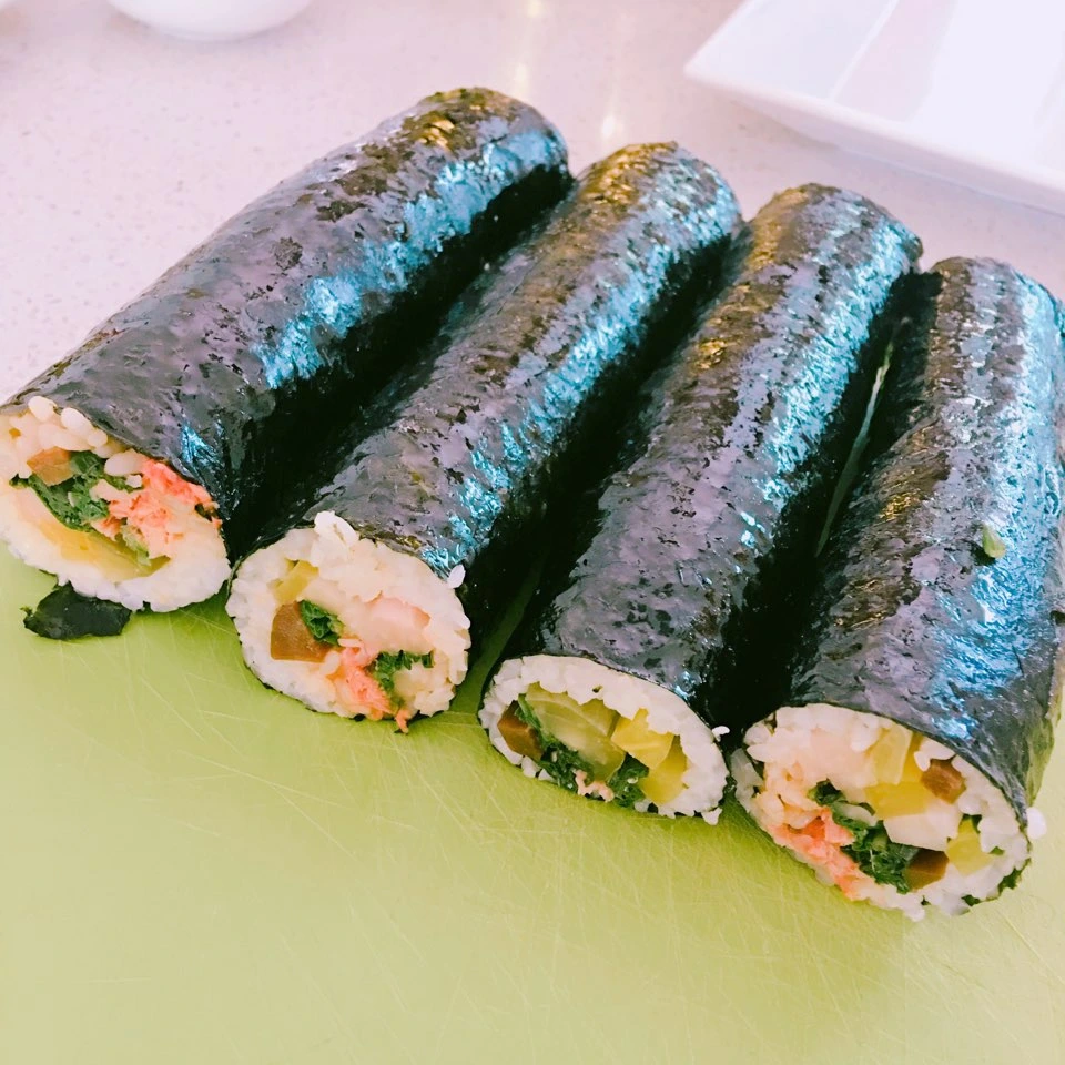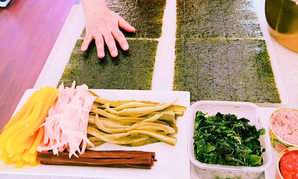 일하며 사는 생활에서 집 밥 해 먹기가 쉽지 않았던지 아이들은 엄마가 해주는 '집밥'을 너무 좋아했다. 퇴직 후 나는 뒤늦게 요리를 배웠다. 수업은 그런대로 따라갔지만 손에 익지 않아 그런지 기억에 남은 게 없다. 다만 레시피 없이 매번 자유로운 메뉴를 만들어내는 특기를 갖게 되었다. 직접 담근 오이피클과 복분자 넣은 보라색 무김치를 넣은 김밥. -넓고 큰 도마에 한 번에 넉장의 김을 펴고 말아 내니 '대량생산'이라며 응원의 휘파람 소리와 함께 빨리 김밥의 꽁지를 먹게 달라는열화를 부리며 식구들은 내 주변에서부~산하다.다들 부산사람 아니랄까 봐.