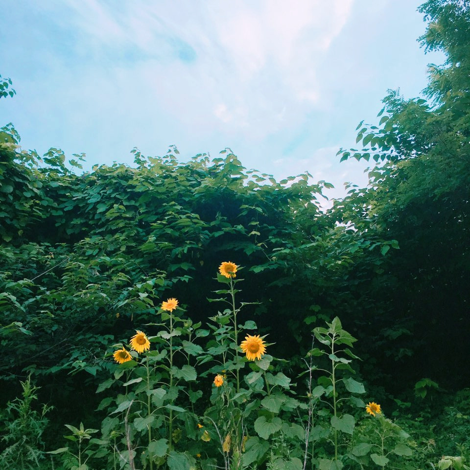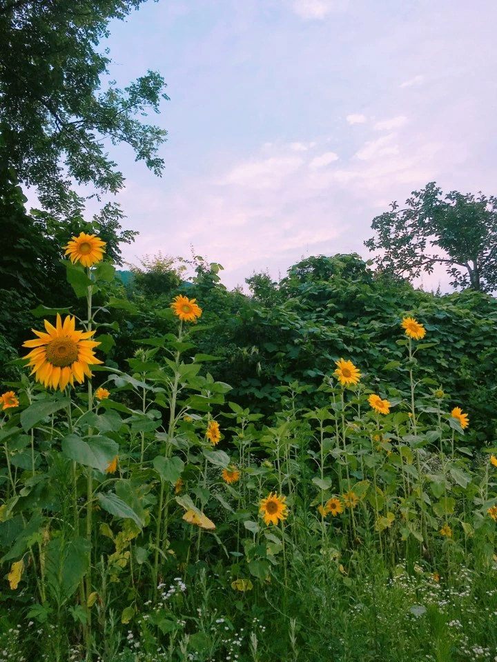 낙엽 쌓인 언덕의 거름진 곳에 핀 풍성한 해바라기. 심긴 곳에 따라 50cm~ 3m의 키 차이가 난다.