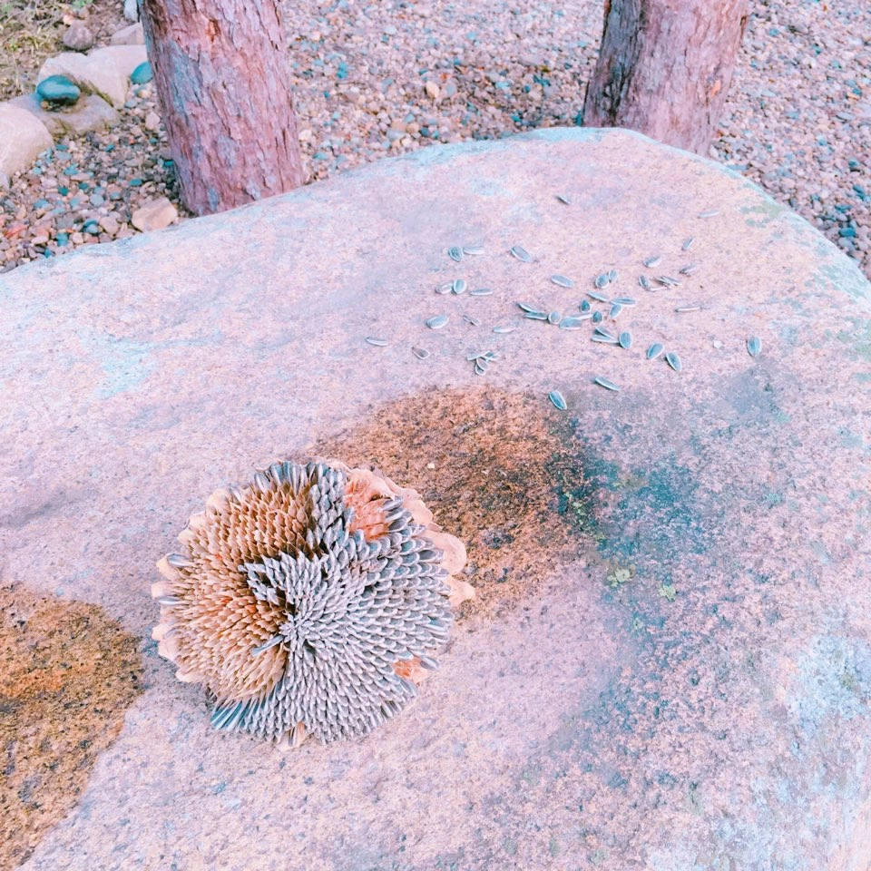 작년에 수확하여 올해에 파종하고 남은 해바라기 씨앗. 다람쥐 두 마리는 날마다 포식한 흔적을 큰암석과 정자 마루에 남겼다. 최근엔 우리가 두두두뱉어놓은 수박씨와 자두 살구 복숭아 씨앗까지 남김없이 먹어치우고 있다.