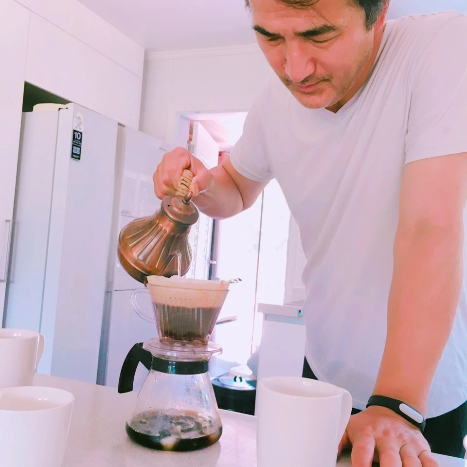 J는 매번 우리의 까탈스러운 취향에 맞춰 심각한 표정으로 각양각색의 커피를 만들어주었다. 토마토와 아로니에 주스는 건강을 위한 조합.